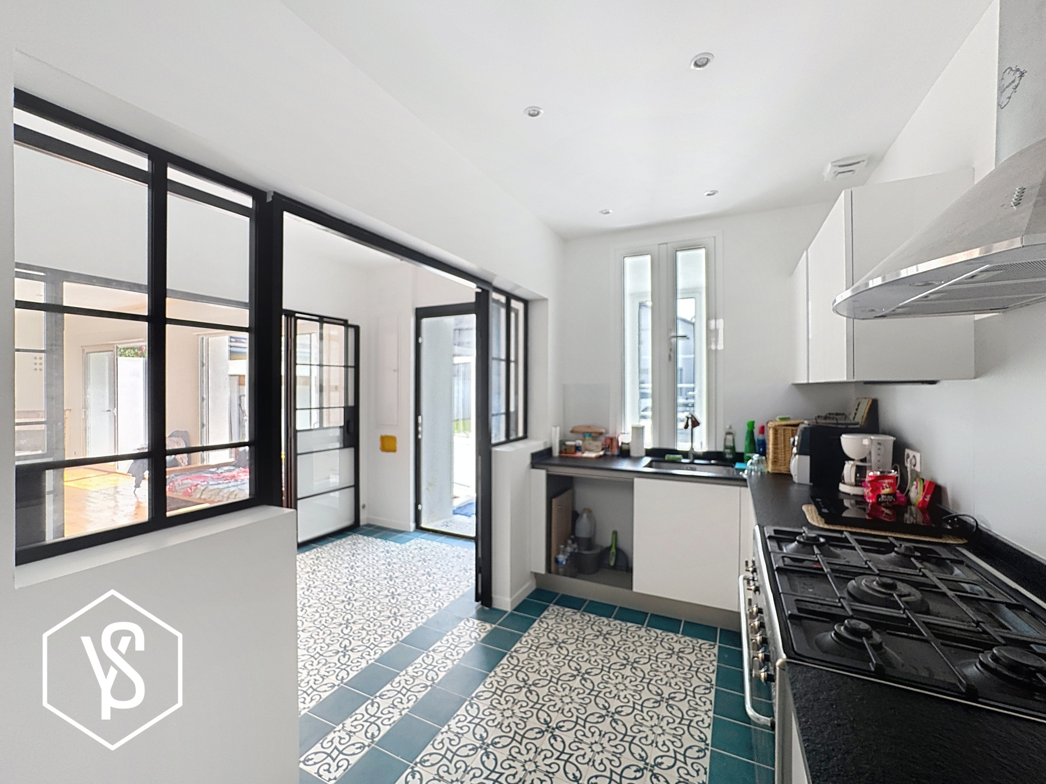 Dès l'entrée, vous serez accueilli par une spacieuse pièce de vie avec séjour et cuisine semi-ouverte par verrière indus'. Cette pièce centrale, invite à la détente et aux moments partagés en famille ou entre amis avec accès direct sur la terrasse et l'appenti couvert. Au sol, parquets d'origines et carreaux ciments d'aujourd'hui.