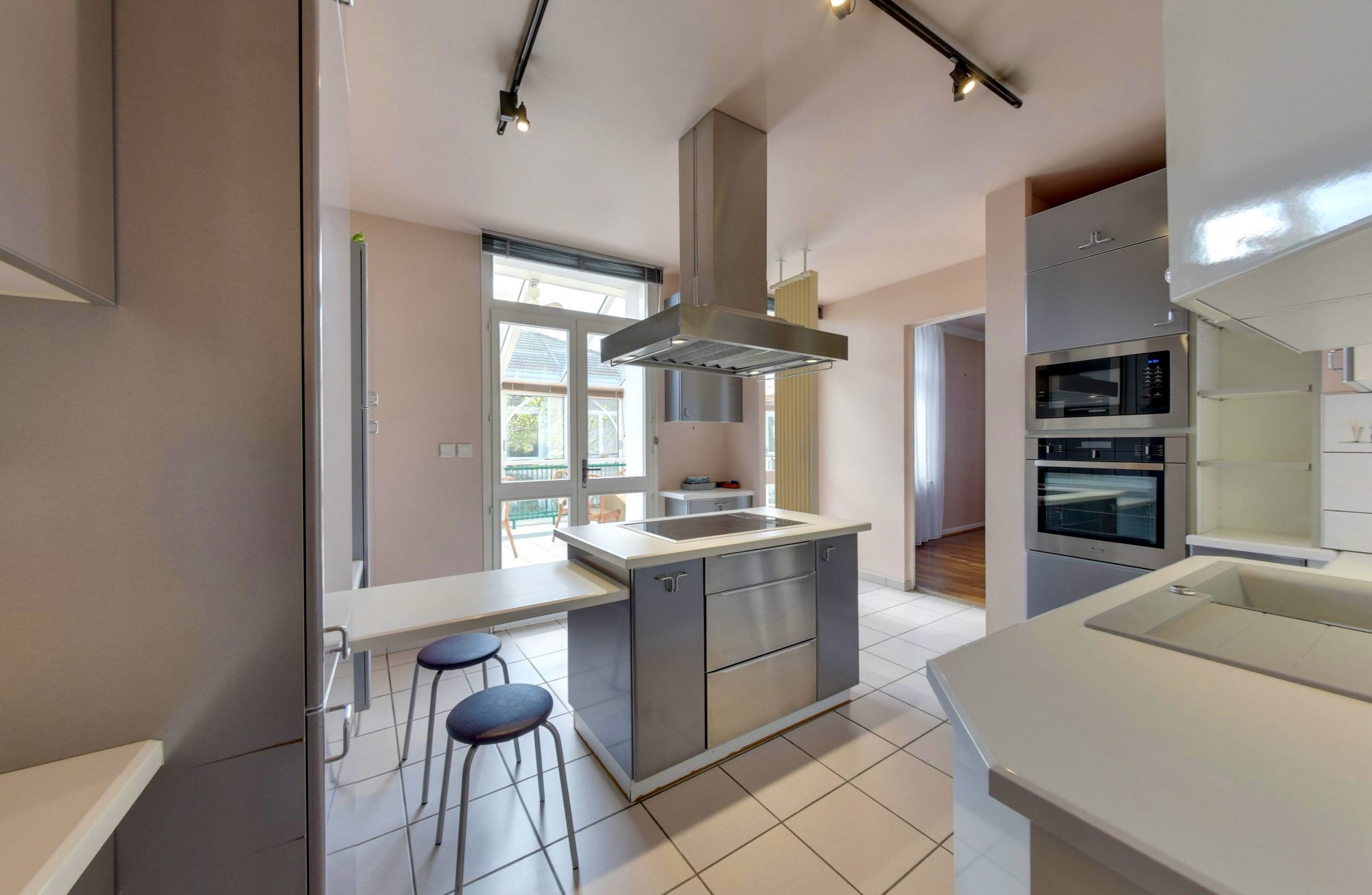 Retour au rez-de-chaussée où une cuisine d'été attenante à une salle à manger offre un accès direct à la magnifique piscine intérieure (chauffée), pour des instants de détente toute l'année.
