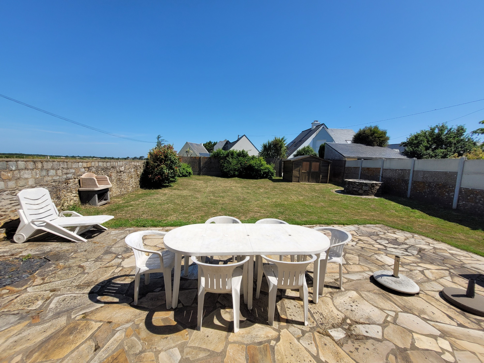 A l'extérieur, le jardin est clos de murs pour partie en pierre, intimiste et sans vis-à-vis, idéal pour profiter du calme. Un garage en bois attenant bien pratique pour les affaires de plage ou de bateau, et un abri de jardin complètent la maison.