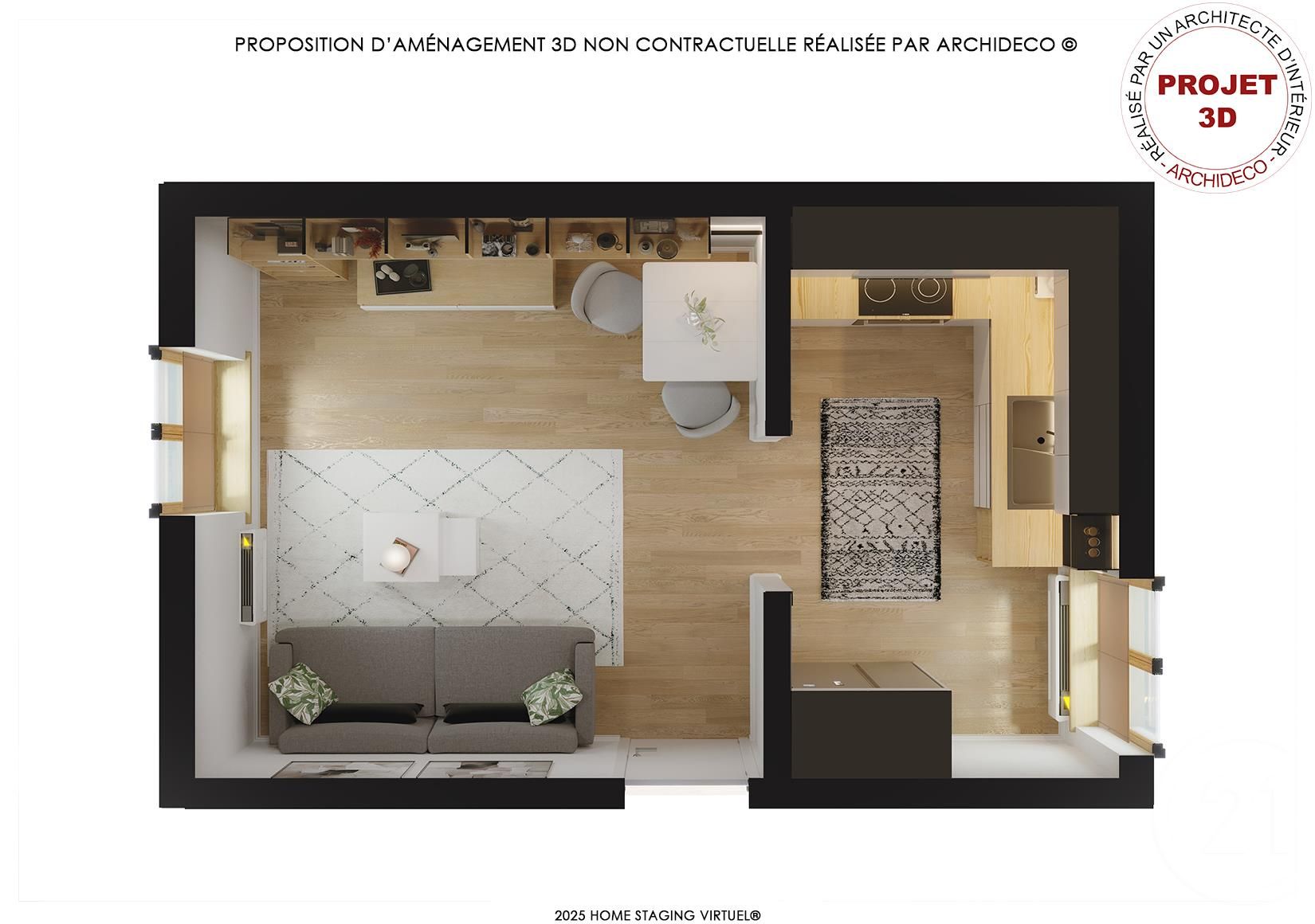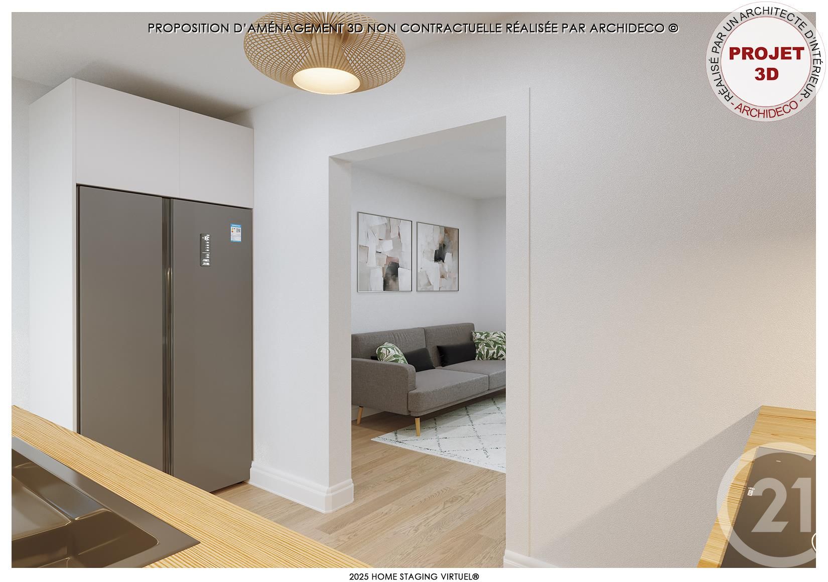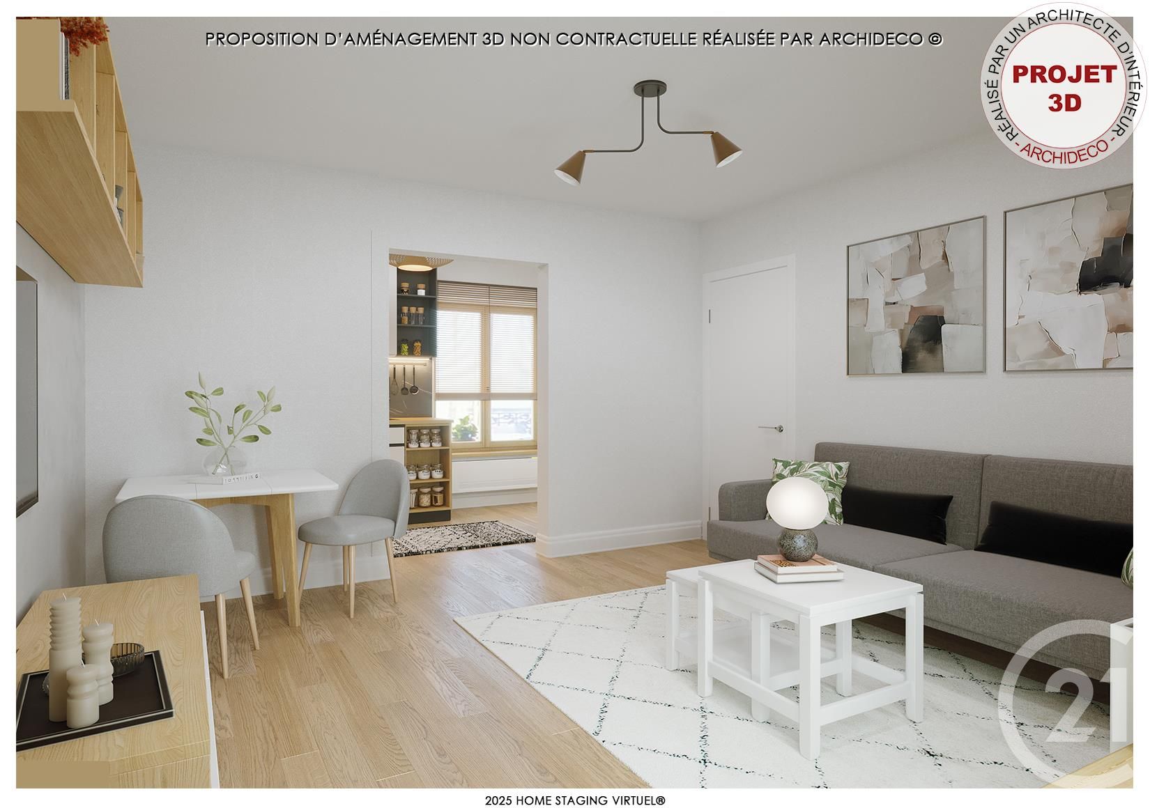 Votre agence vous présente un projet ARCHIDECO - HOME STAGING VIRTUEL® réalisé par un architecte d'intérieur (proposition d'aménagement 3D non contractuelle). Contactez-nous pour plus d'informations. Prix : 120000.0  euros, Honoraires charge vendeur. Copropriété :