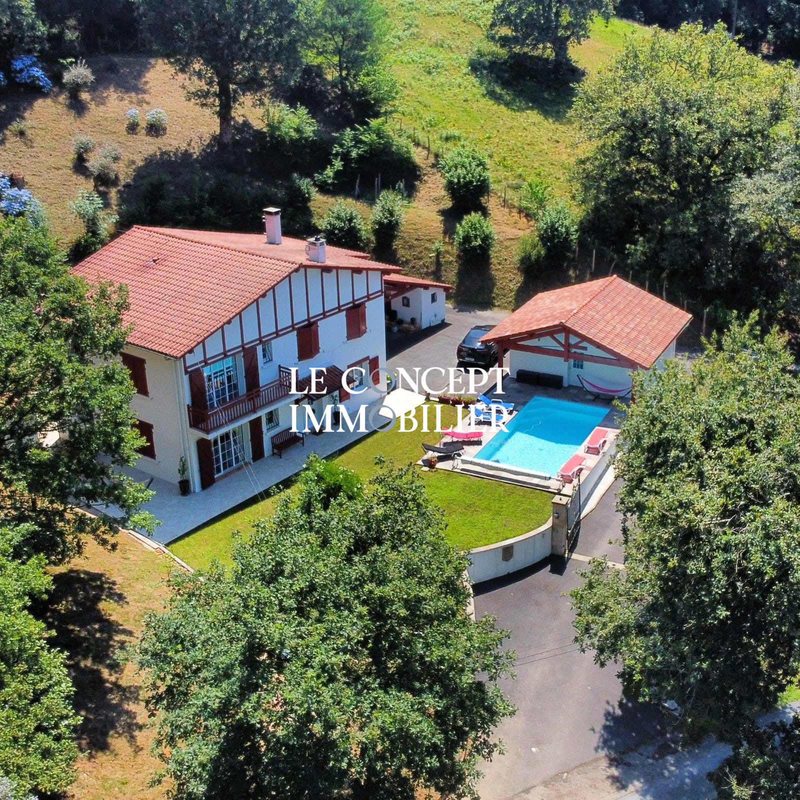 Derrière sa façade à l'élégante signature basque, la maison déploie près de 190 m². Elle comprend une entrée spacieuse, un salon avec cheminée, une cuisine équipée, cinq chambres dont une suite parentale, ainsi qu'un bureau, une buanderie, deux salles de bains et deux toilettes