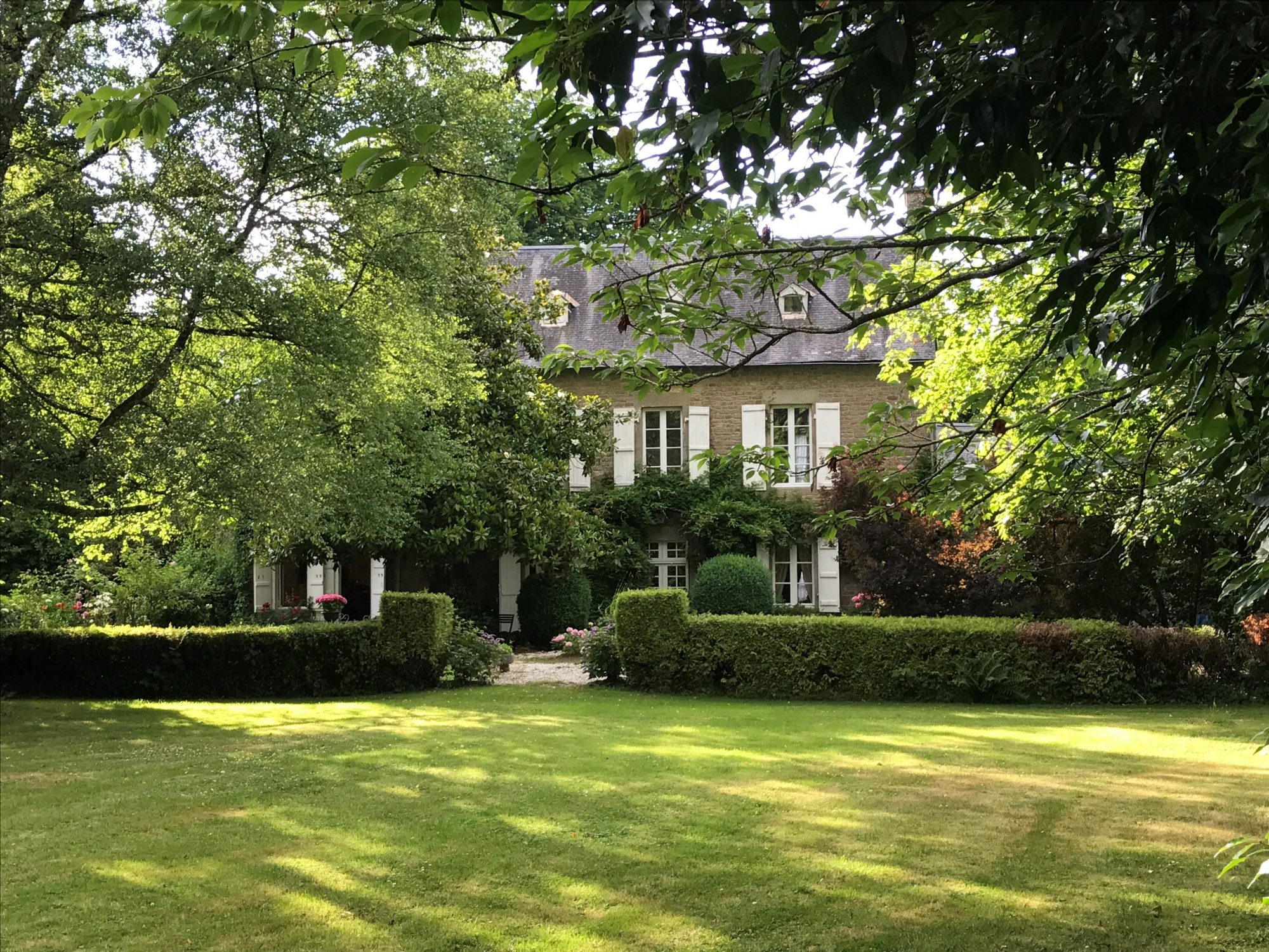 Depuis le logis, vous pénétrez dans le jardin en empruntant des allées gravillonnées bordées de rosiers et d'hortensias qui vous amènent à une verte clairière plantée d'arbres centenaires.