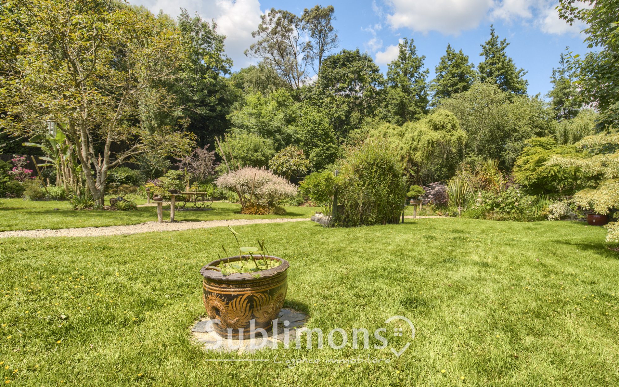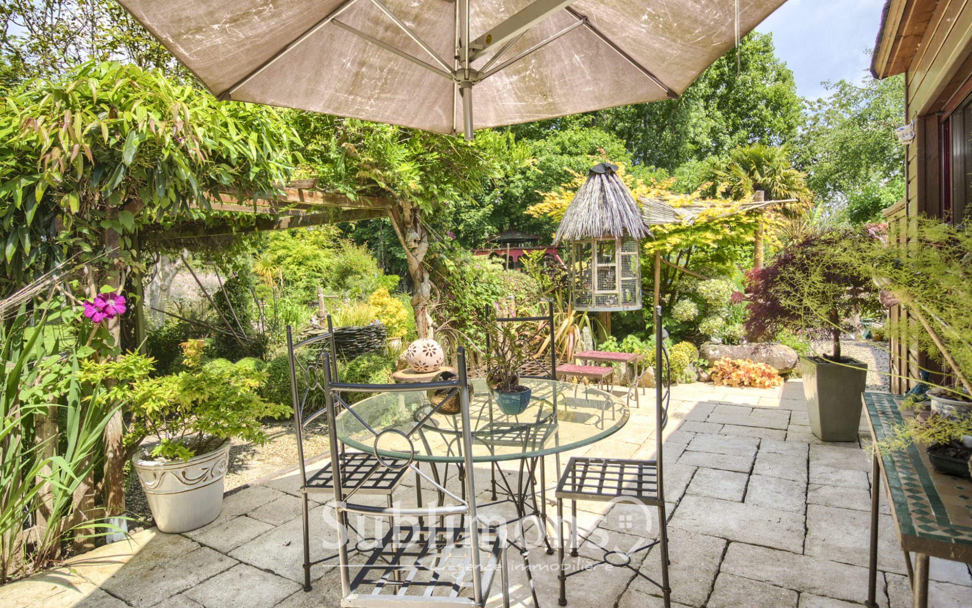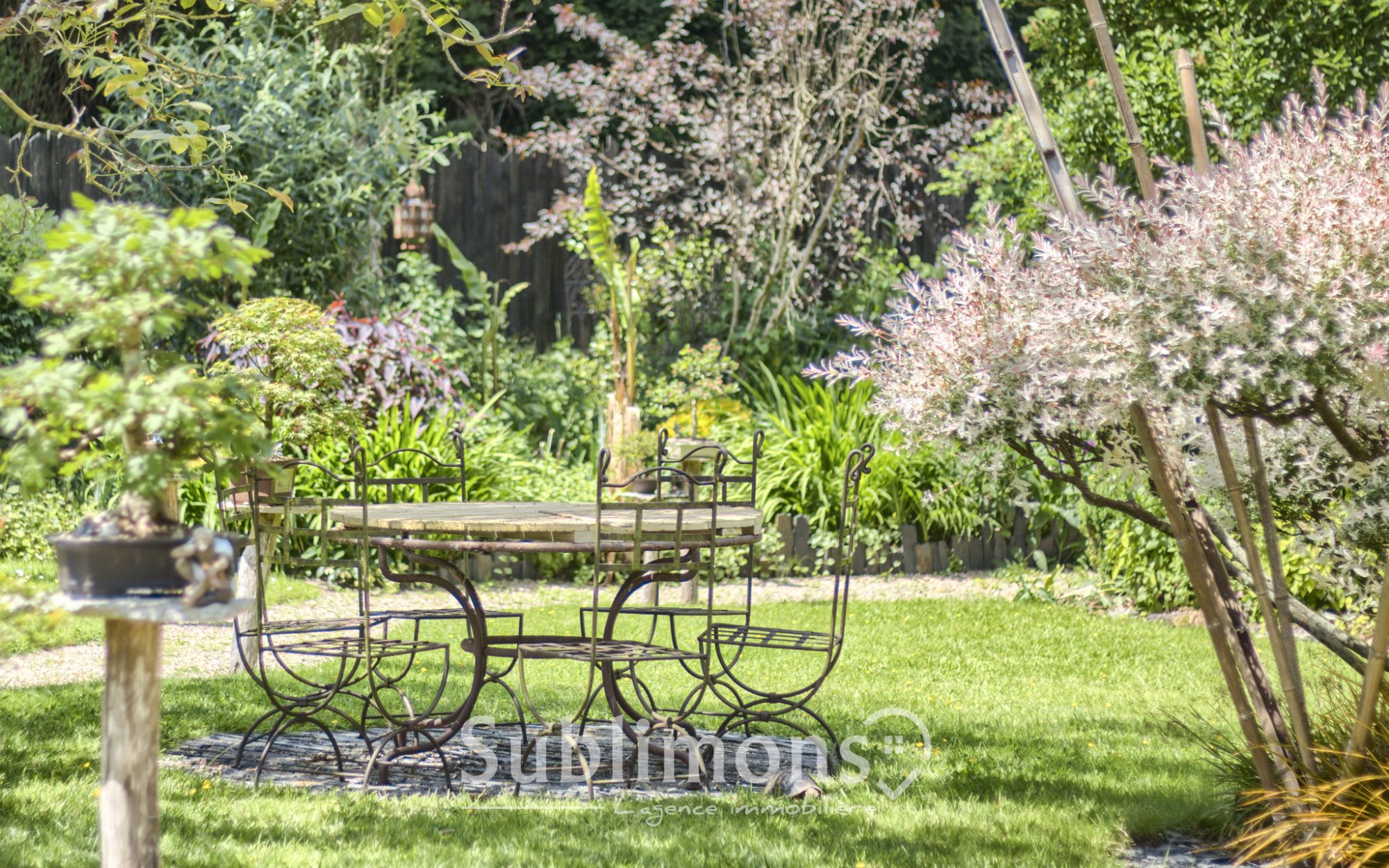 Disposition : Salon, pièce à vivre lumineuse ouverte sur terrasse et jardin, cuisine aménagée, véranda avec cheminée (utilisable en chambre ou atelier), salle d'eau avec WC. À l'étage : grande chambre avec dressing et salle d'eau privative ; au second étage : deux chambres mansardées avec vue sur le jardin.