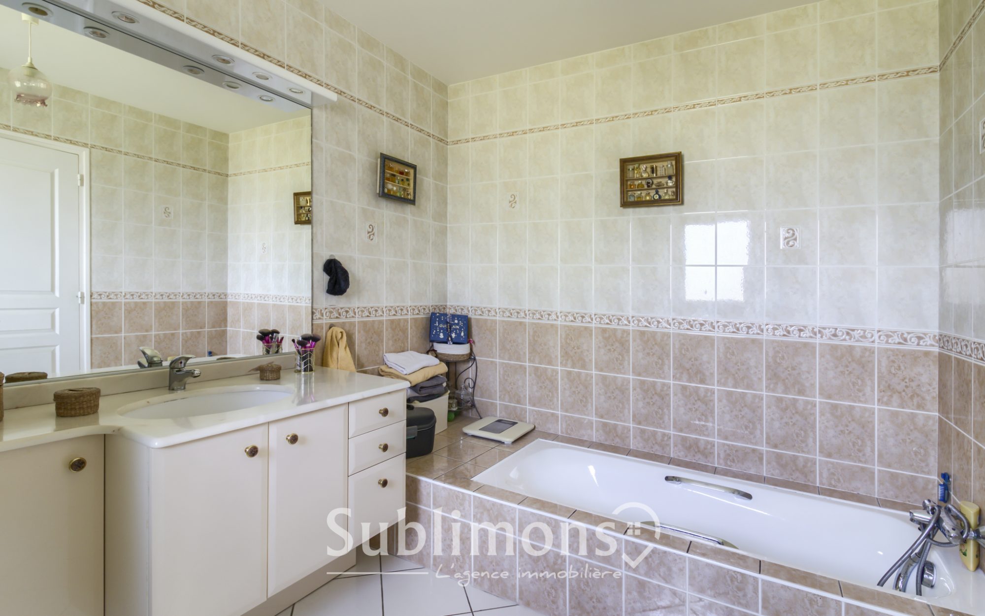 Le rez-de-chaussée propose également une chambre avec salle de bain privative (baignoire et douche), ainsi que des WC indépendants, offrant ainsi une vraie vie de plain-pied.
