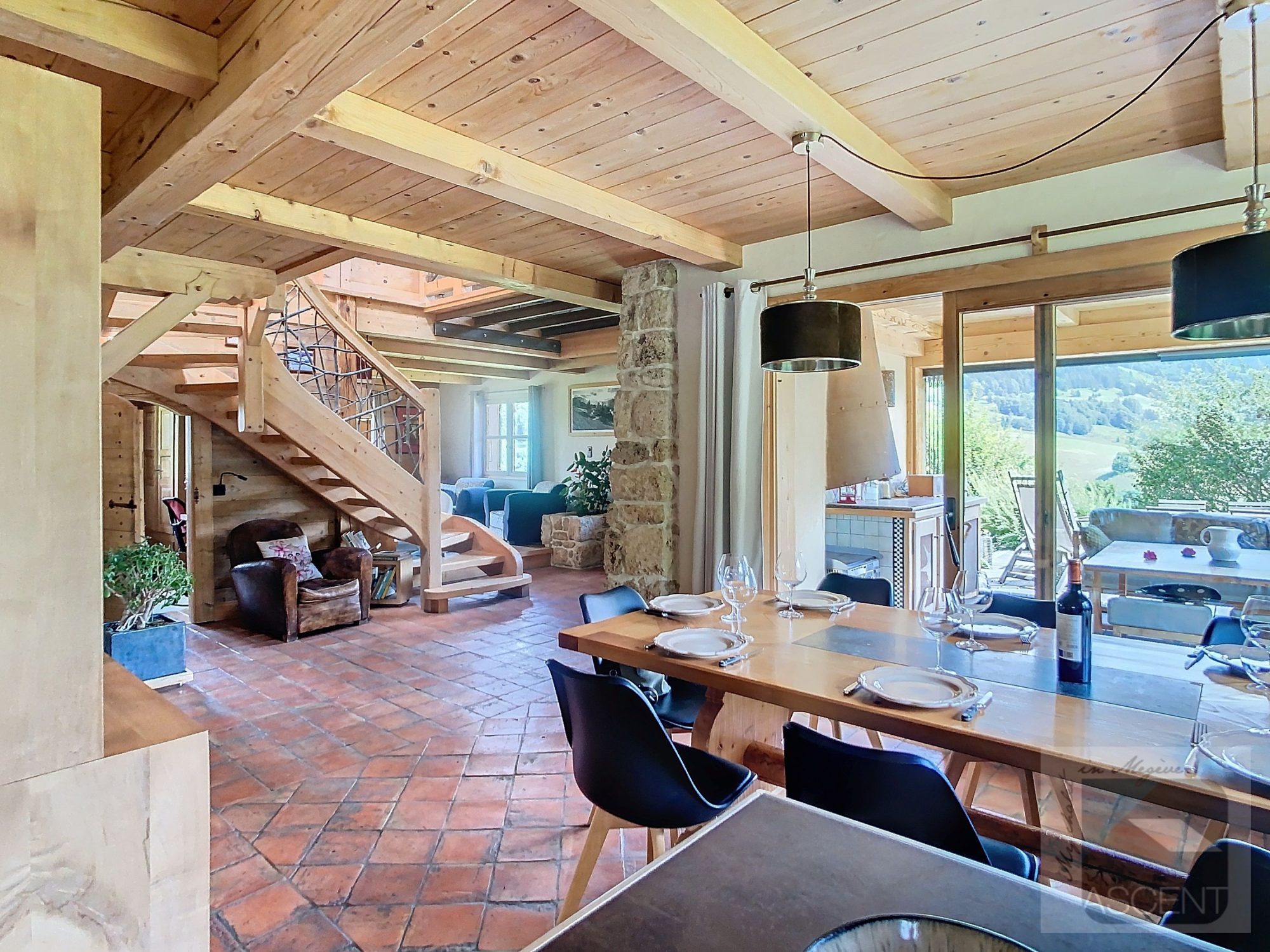 Ce chalet sans vis-à-vis est situé sur le versant du hameau du Villard et offre une vue magnifique sur le village et la chaîne du Mont-blanc. Un immense terrain non constructible se déploie devant le chalet côté sud.