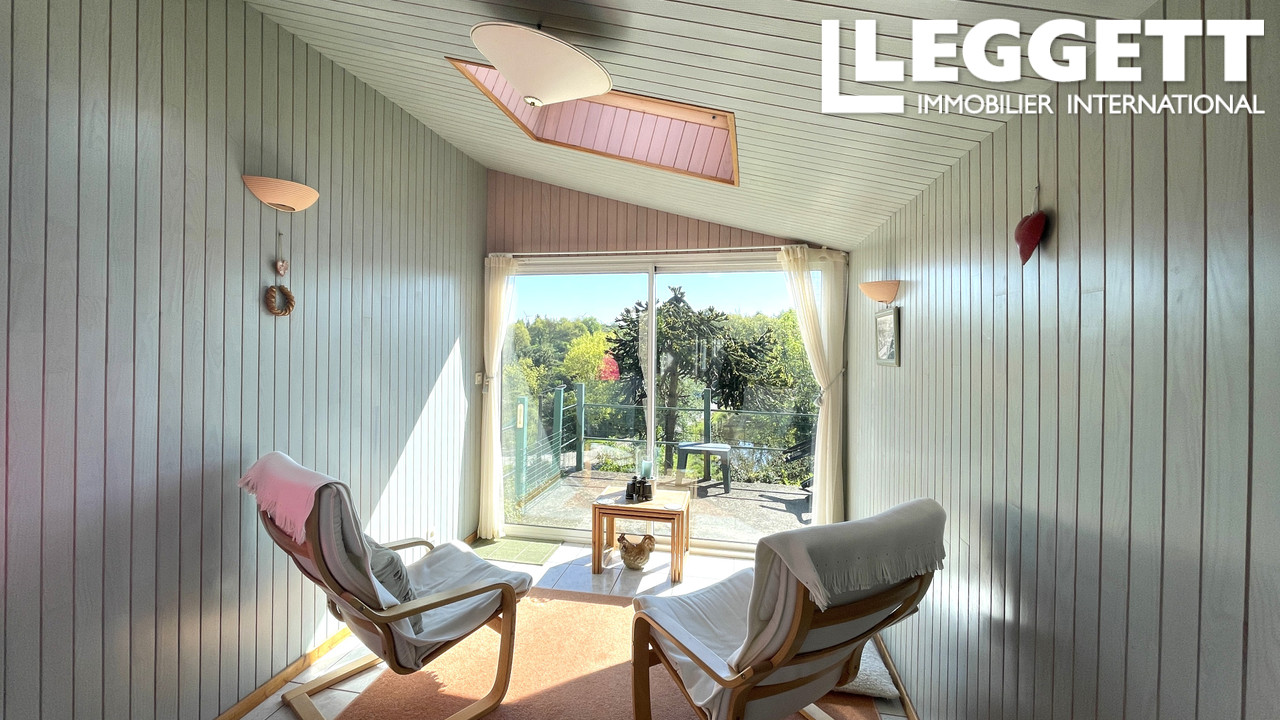L'entrée mène directement à la véranda ensoleillée, qui bénéficie d'un balcon offrant une magnifique vue sur l'étang. Ce niveau comprend également une cuisine, un salon avec cheminée, une salle d'eau avec WC, ainsi que deux chambres. Le sous-sol dispose d'un grand espace de rangement et de la plomberie pour un lave-linge.