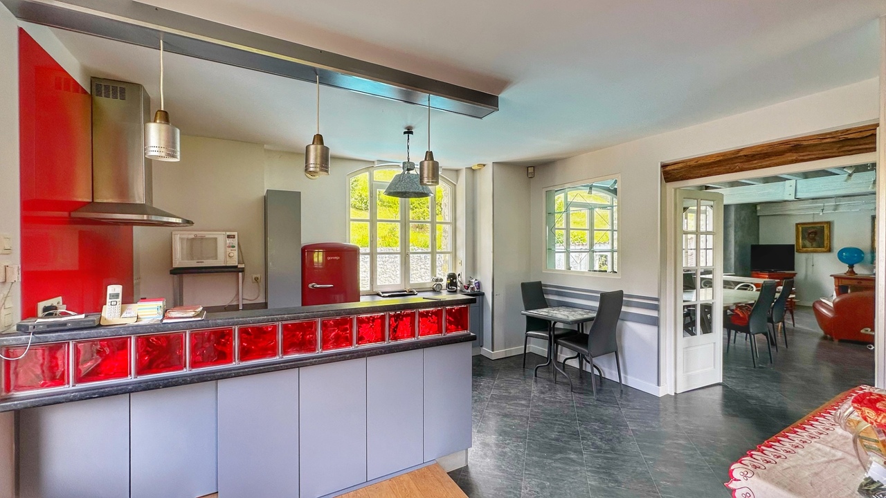 La 2° maison: en pierres d'une surface de 176 m² (193 m² en surface utile) se compose au rdc d’une entrée, d’une cuisine équipée de 24 m², d’un séjour de 62 m² avec cheminée et belle hauteur grâce à la mezzanine, ainsi que d’un WC (sanibroyeur).