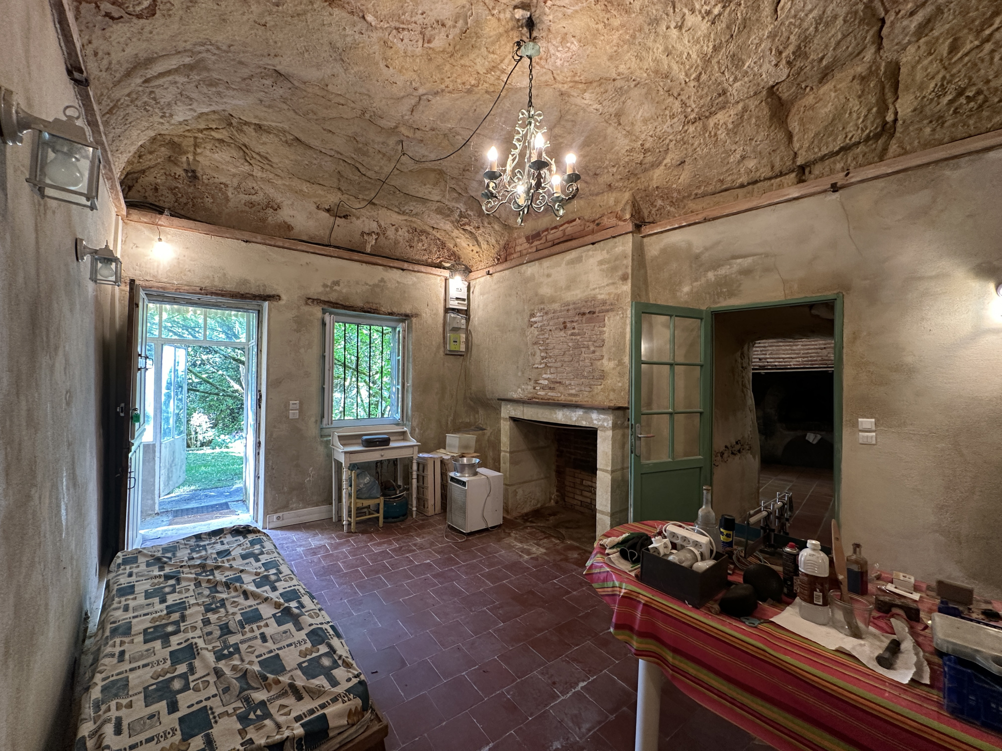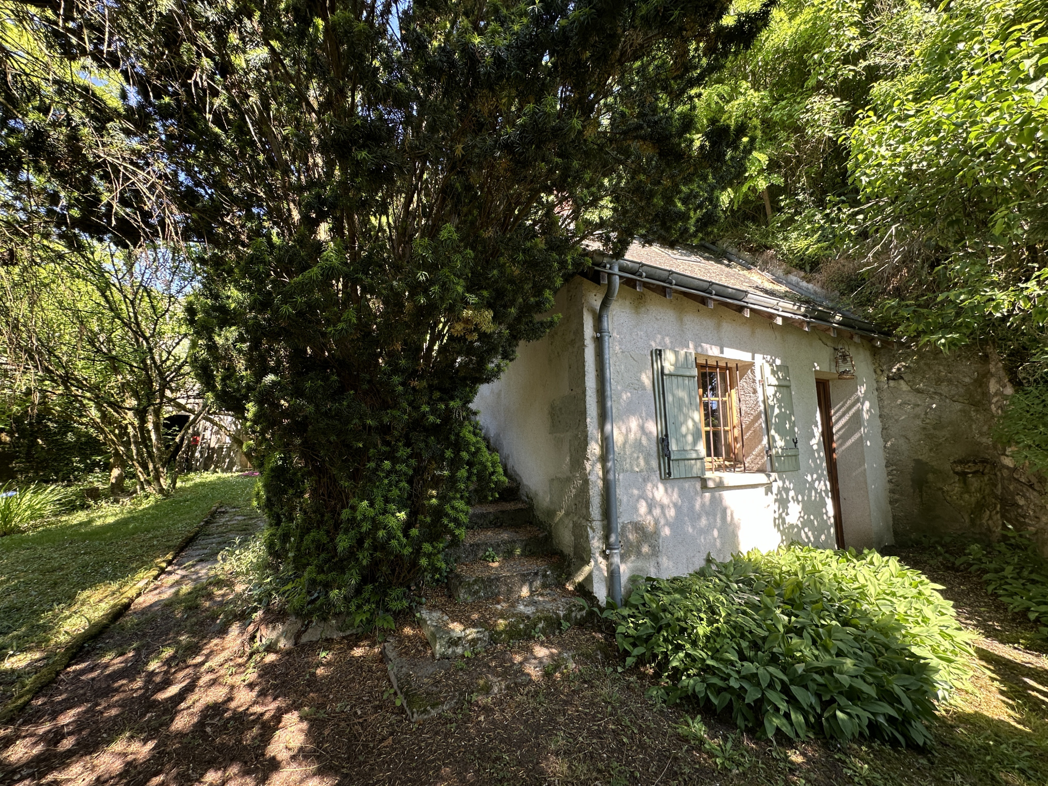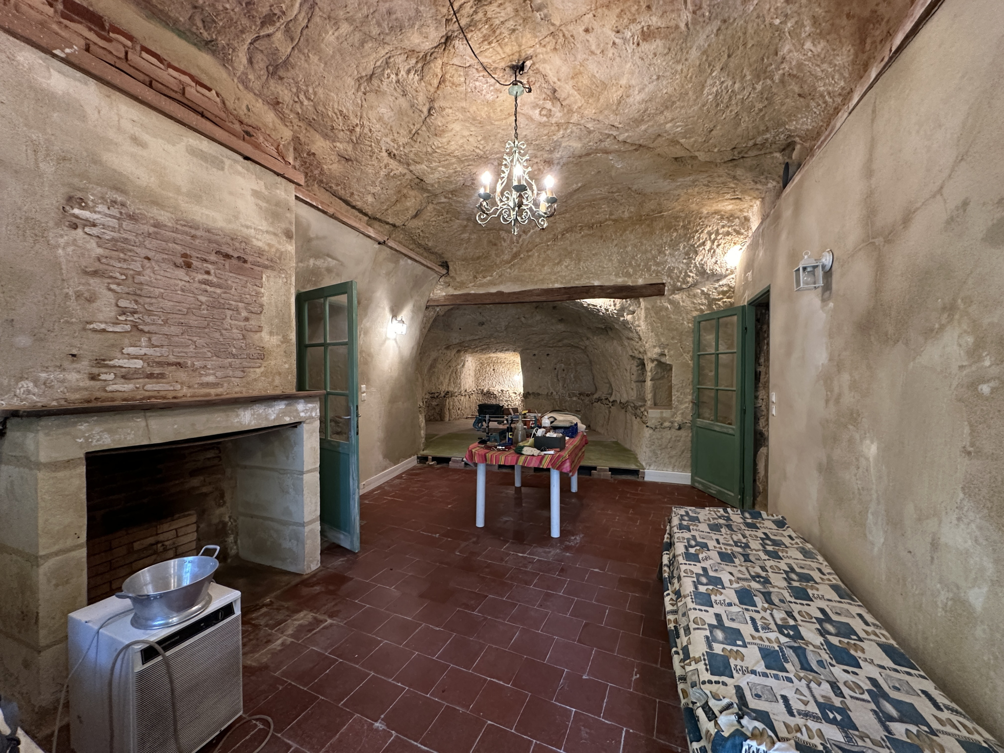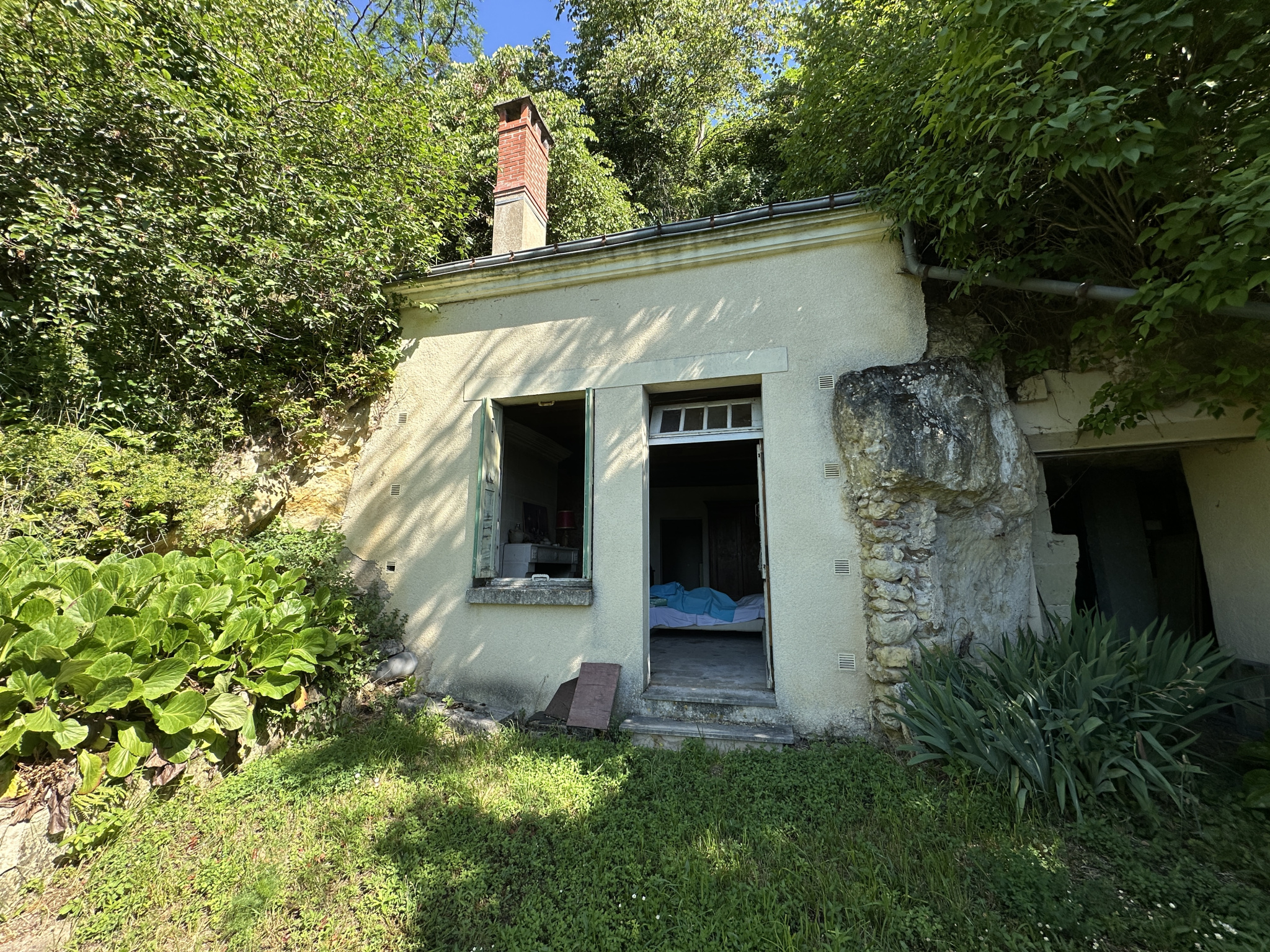 3 pièces troglodytiques (cuisine avec four à pain, séjour, dégagement reliées à une maisonnette adossée au coteau avec salle d'eau, water-closets et chambre au-dessus, cave communicante à usage d'atelier).