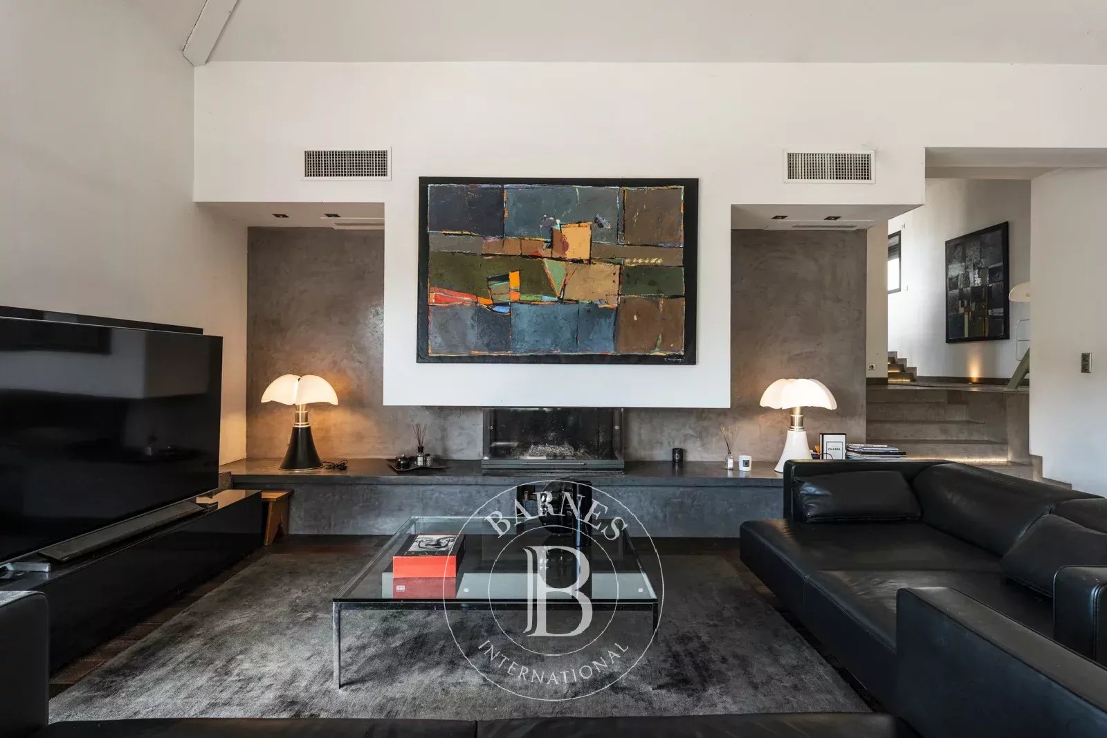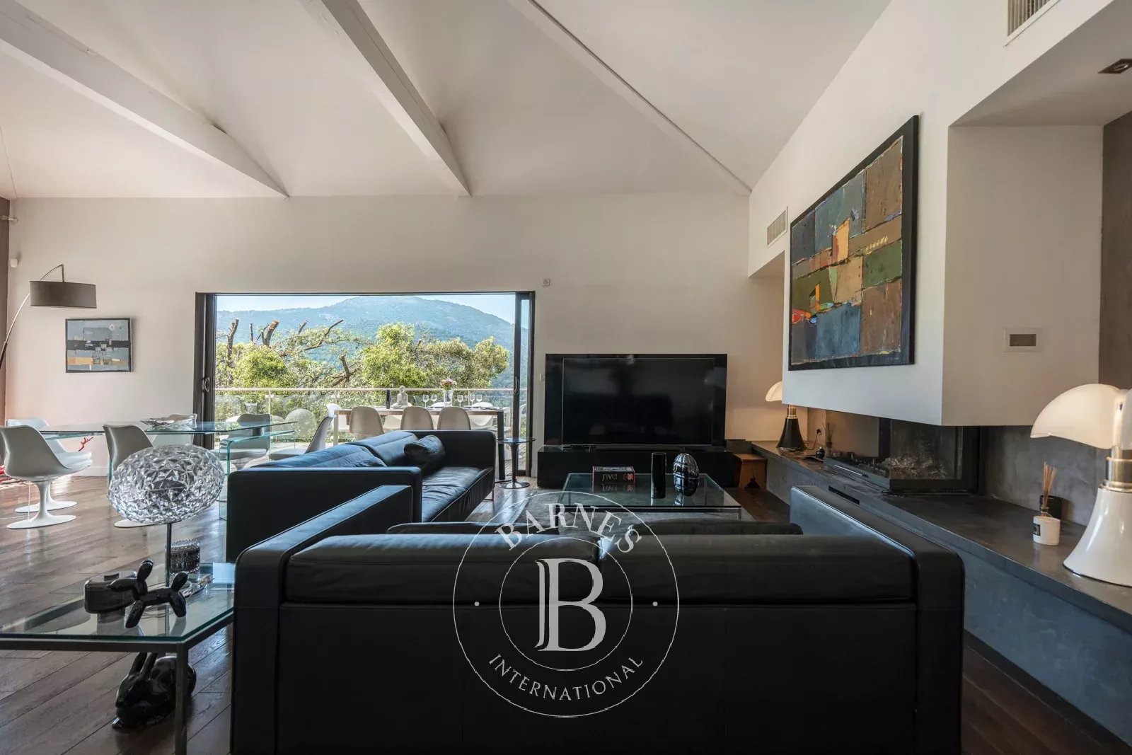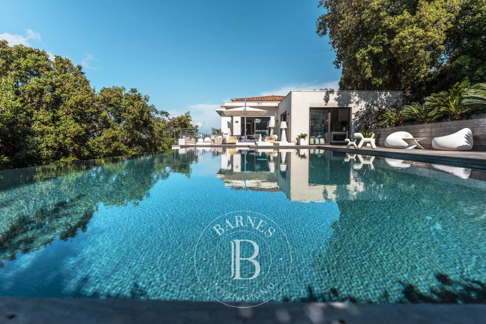 La villa est édifiée sur un terrain arboré et un jardin paysagé d’oliviers centenaire d’environ 2 100 m² avec piscine à débordement chauffée.