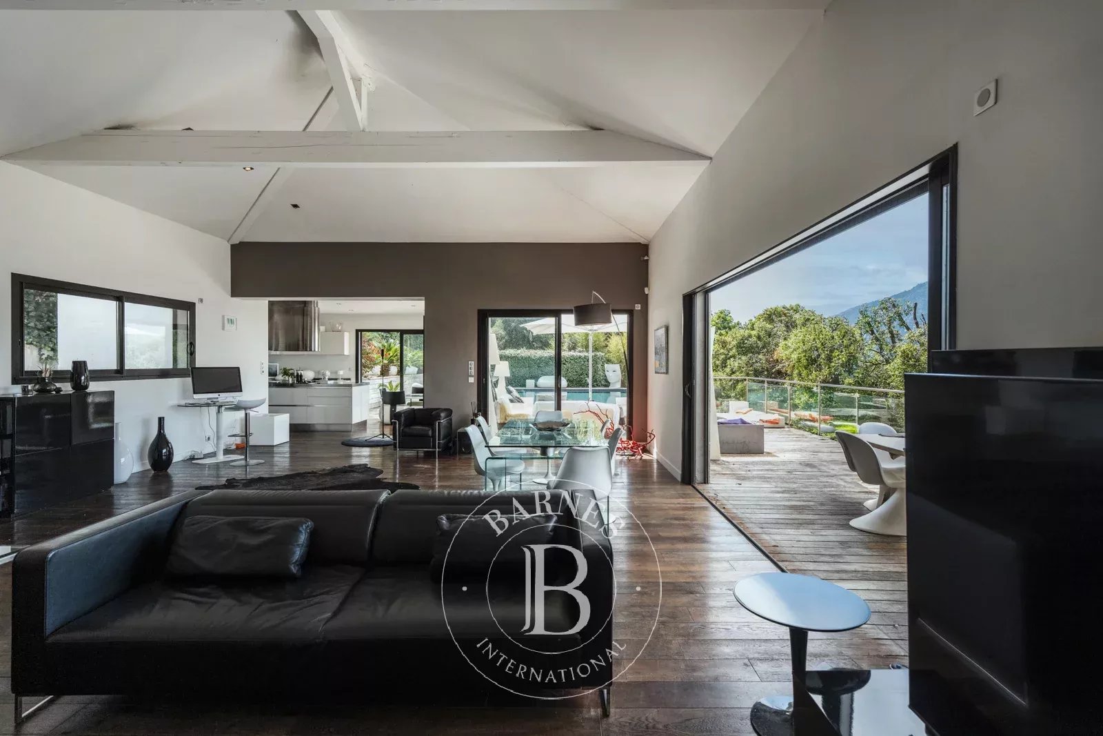 Cette villa d’architecte de plain-pied avec vue panoramique sur les montagnes d’environ 200 m², offre une pièce de vie avec cheminée, une cuisine avec îlot ouverte sur de large terrasse et une buanderie.
