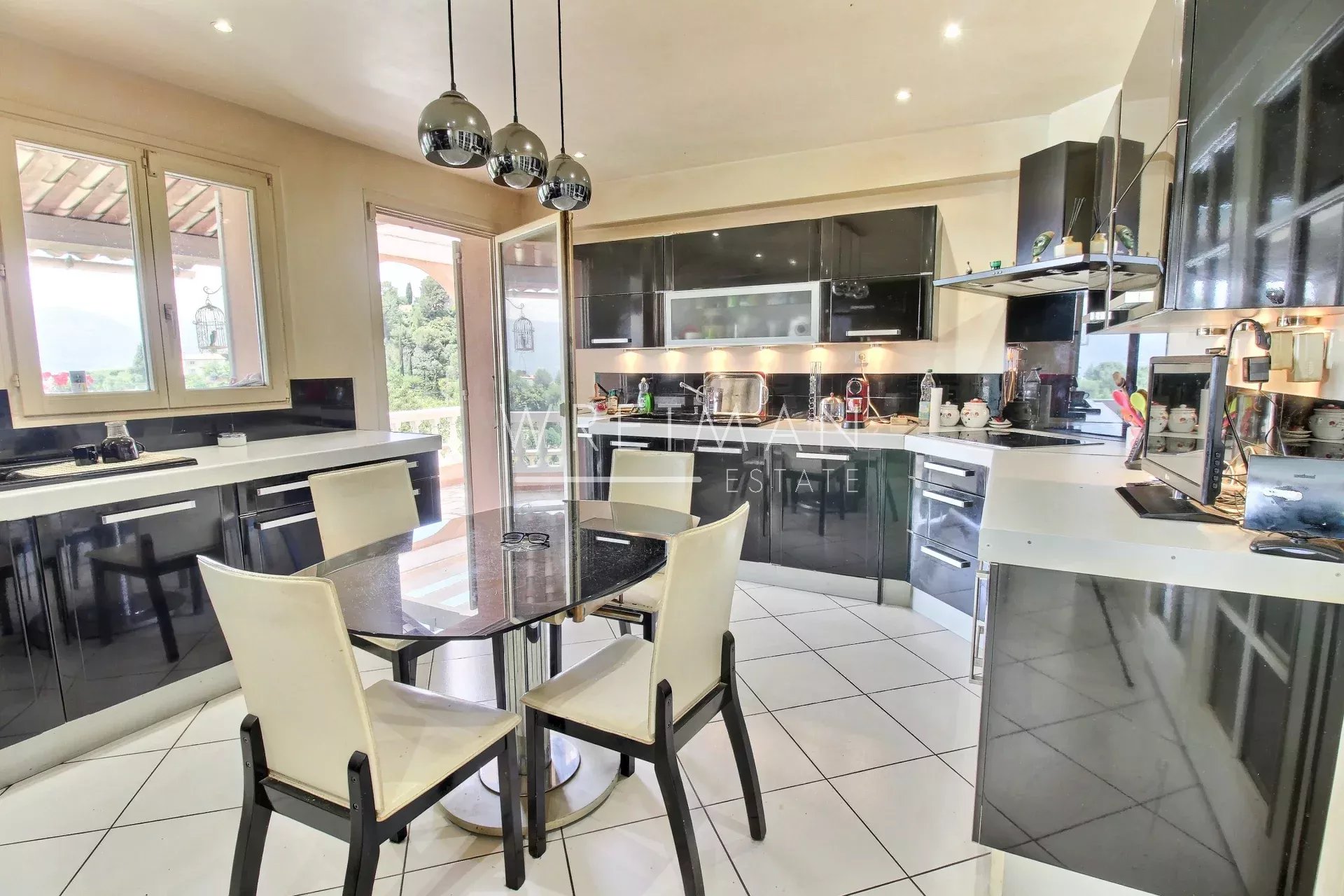 La terrasse partiellement couverte prolonge harmonieusement l’espace repas intérieur, offrant un cadre idéal pour profiter de repas en plein air tout au long de l’année, avec une vue dégagée de la piscine jusqu’à la mer. Sur le terrain de 5000 m2, se trouve un espace d'arbres fruitiers, un garage fermé, une grande cave, ainsi qu’un vaste espace pouvant accueillir plusieurs dizaines de voitures.
