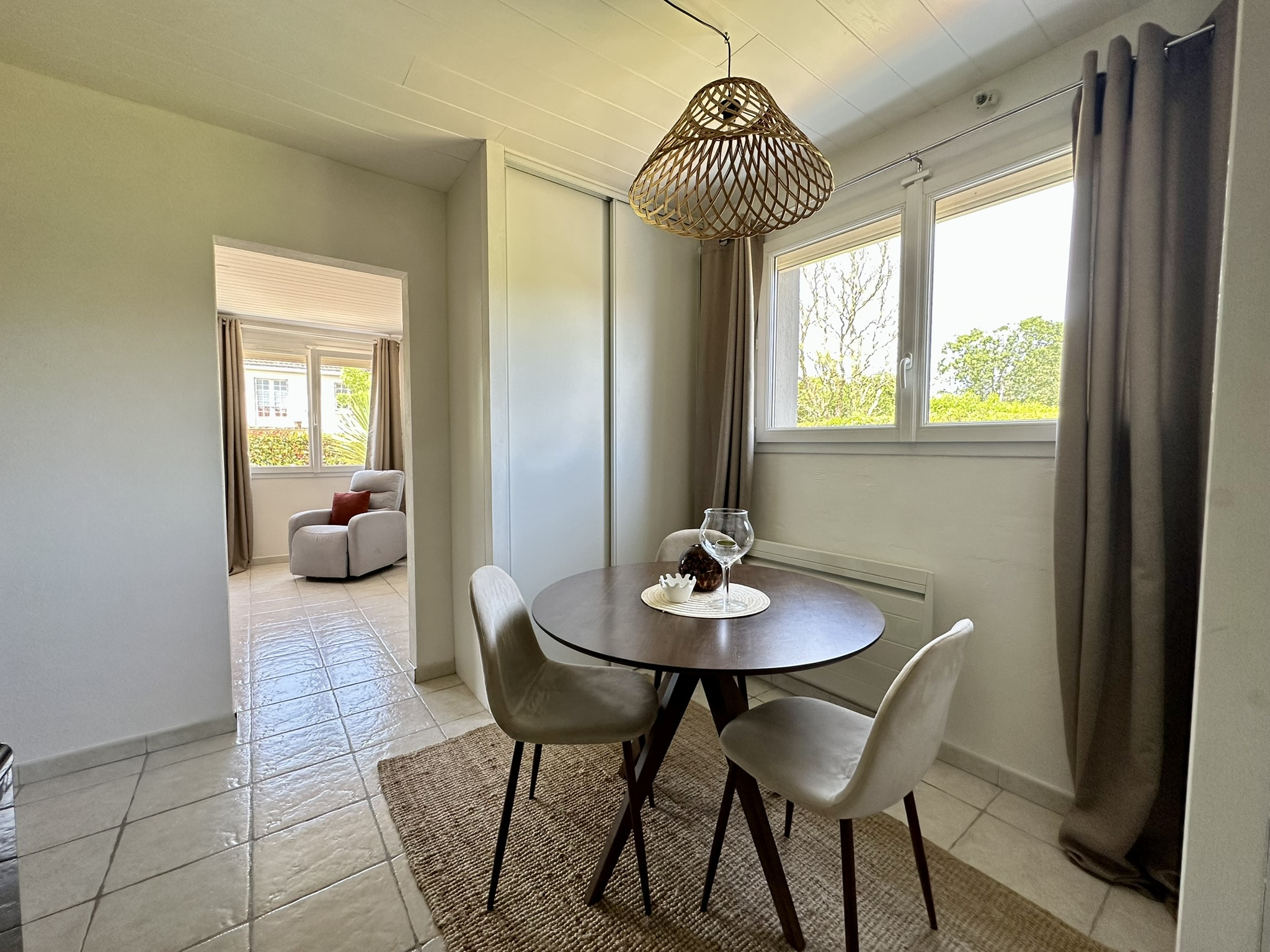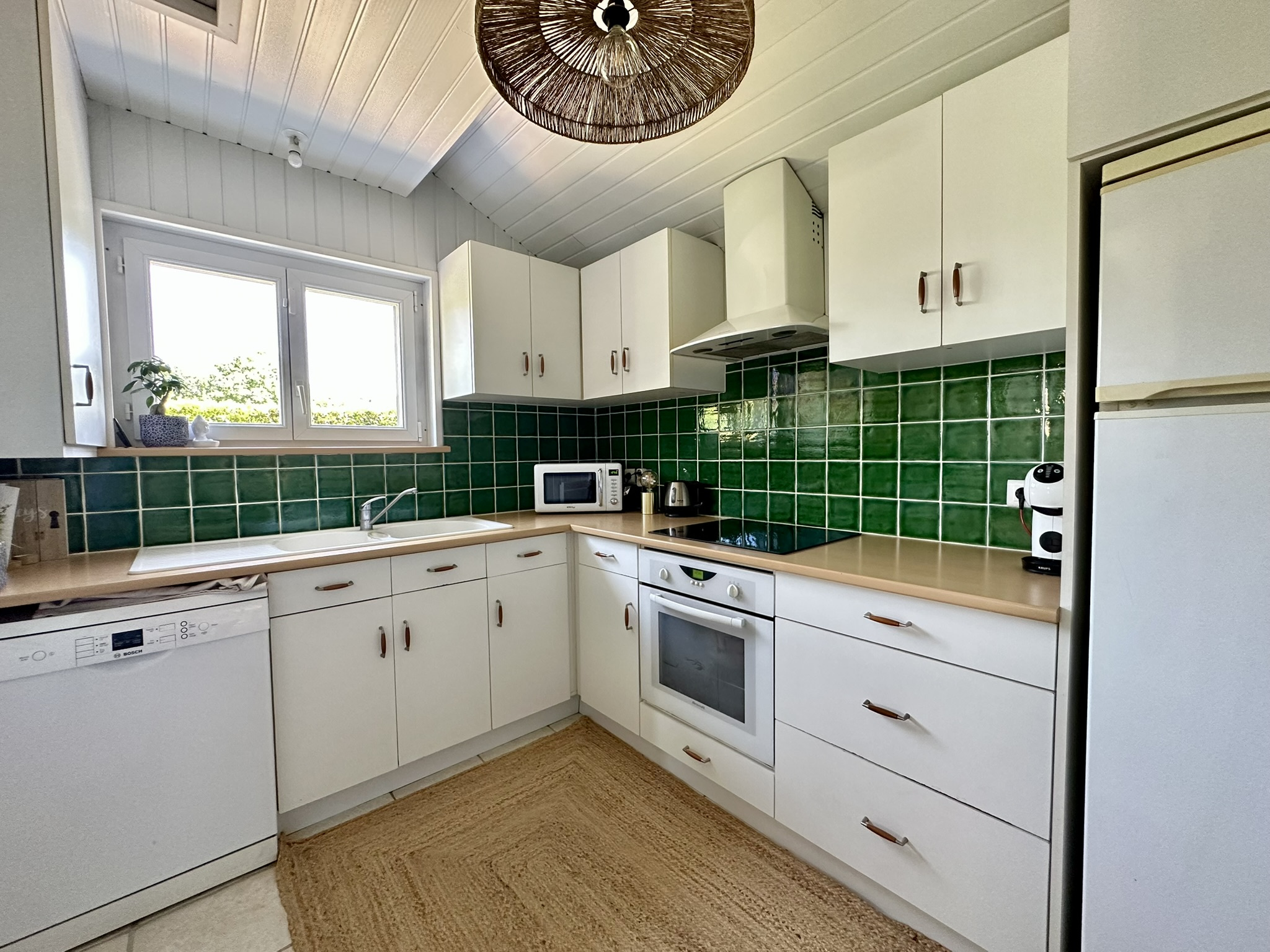 Pour le reste de la villa, nous retrouvons : une cuisine aménagée et équipée, trois chambres, d'une salle d'eau comprenant meubles haut et bas, douche et sèche-serviettes, ainsi que d'un WC indépendants. Un second salon (pouvant faire office d'un bureau ou d'une autre chambre) avec cheminée complète l'ensemble.