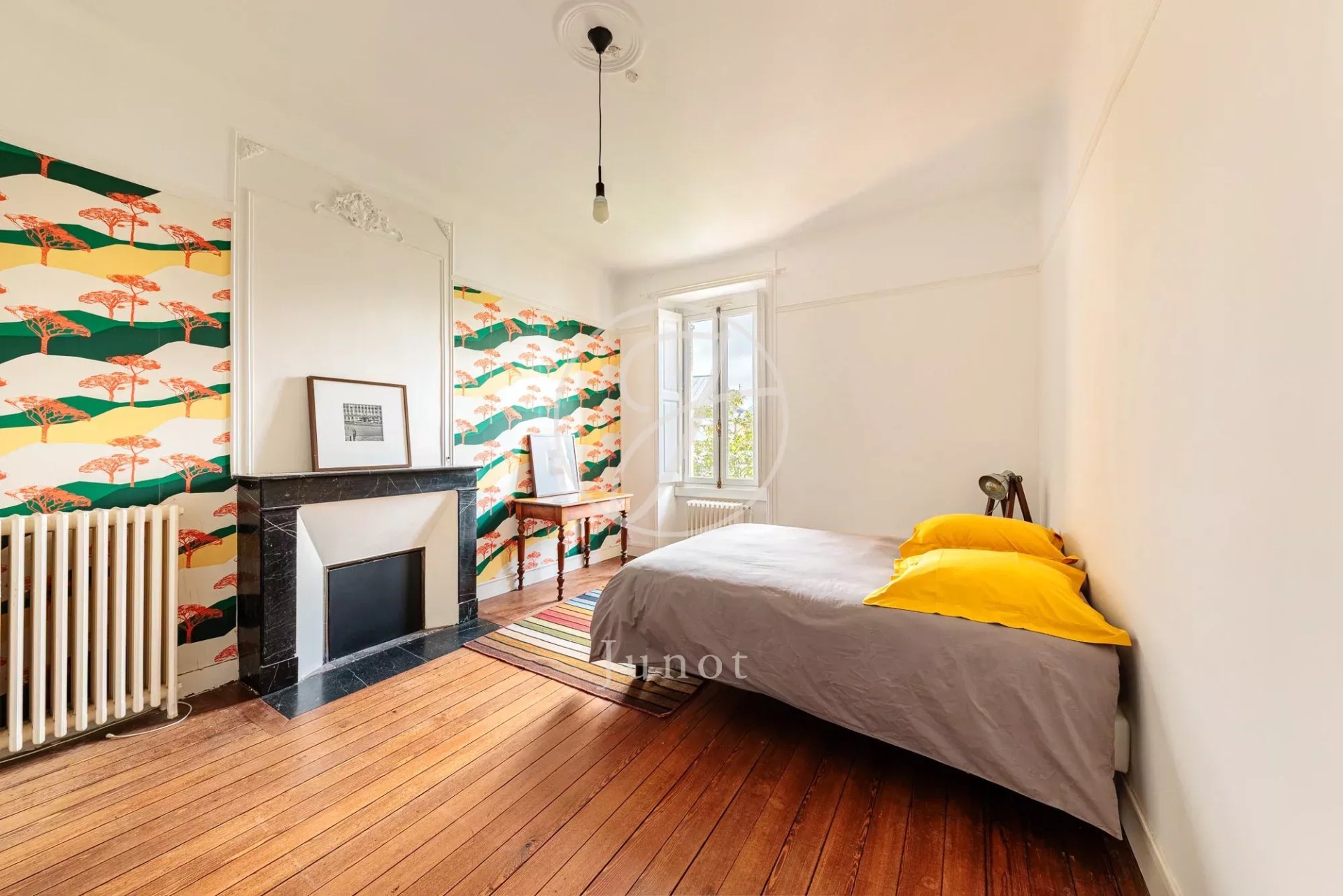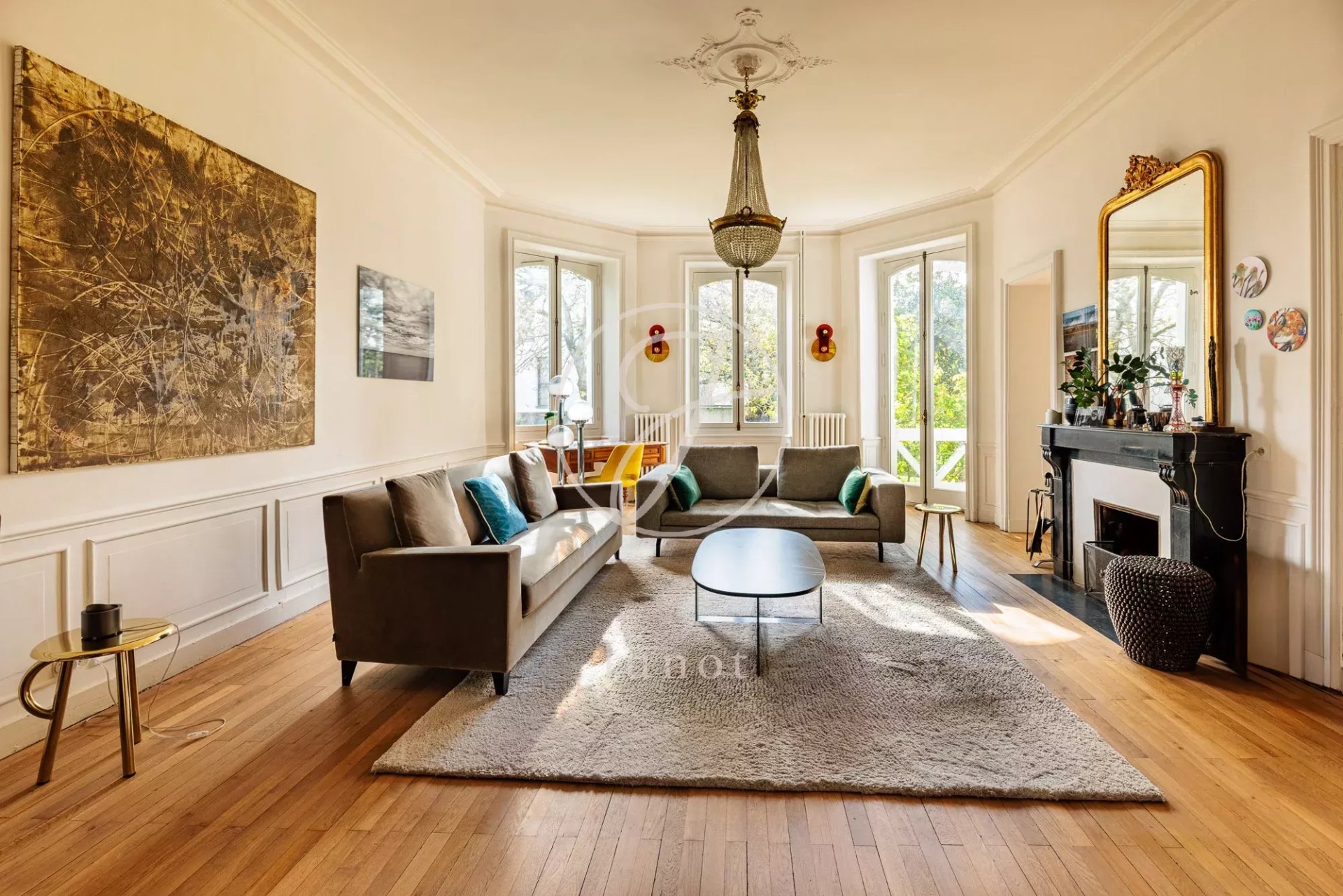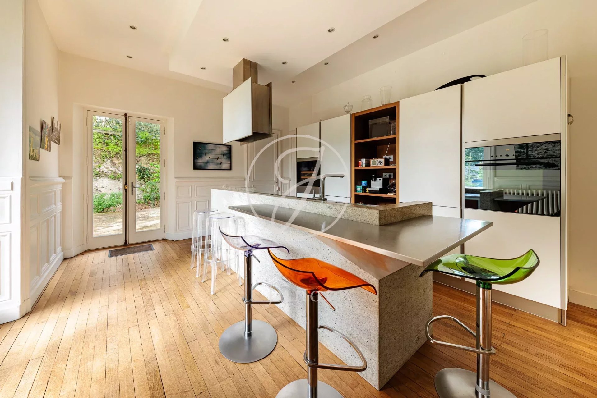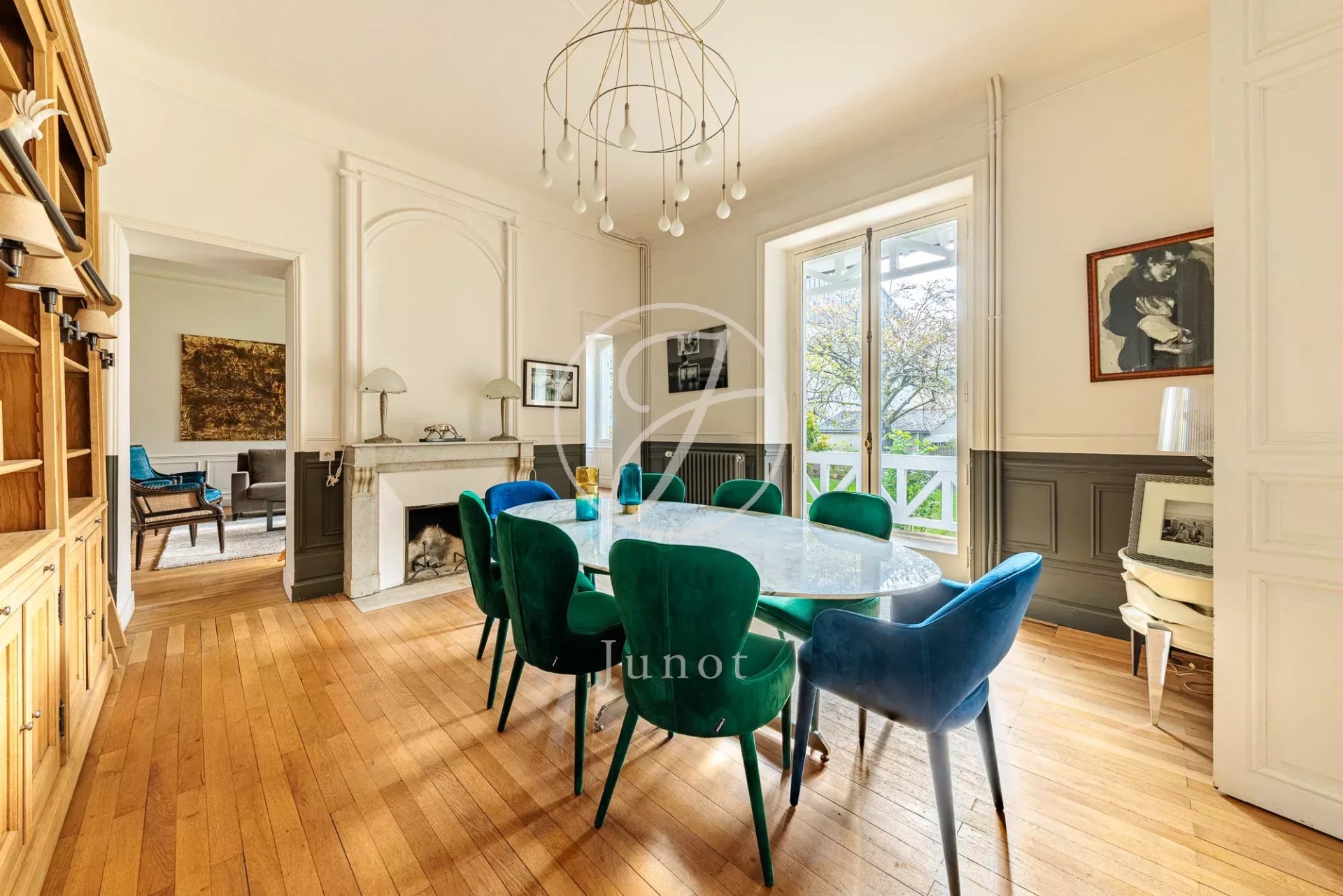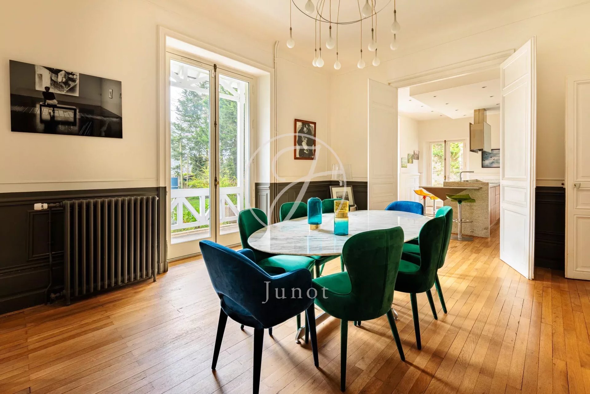 Elle offre 246 m² habitables (260 m² au sol) dont 160 m² de plain-pied. Au rez-de-chaussée, entrée sur carreaux de ciment, trois très belles pièces de vie en enfilade formant un ensemble de 90 m² sur parquet avec cuisine aménagée et équipée, salle à manger avec cheminée, double salon traversant avec cheminée et espace bibliothèque salon de musique, bureau aménagé, lingerie, toilettes, master room avec dressing et salle de bains privative avec douche et toilettes.