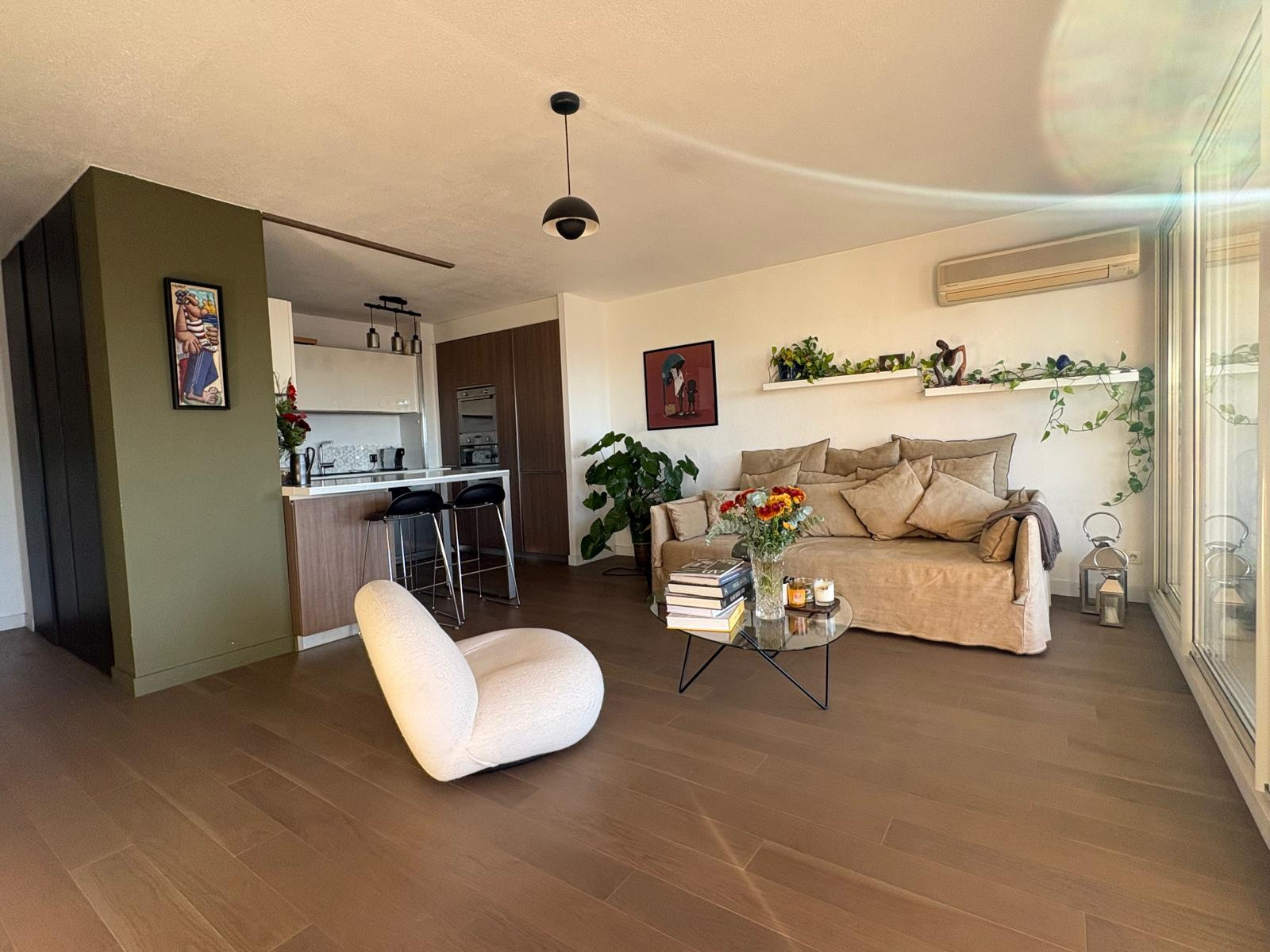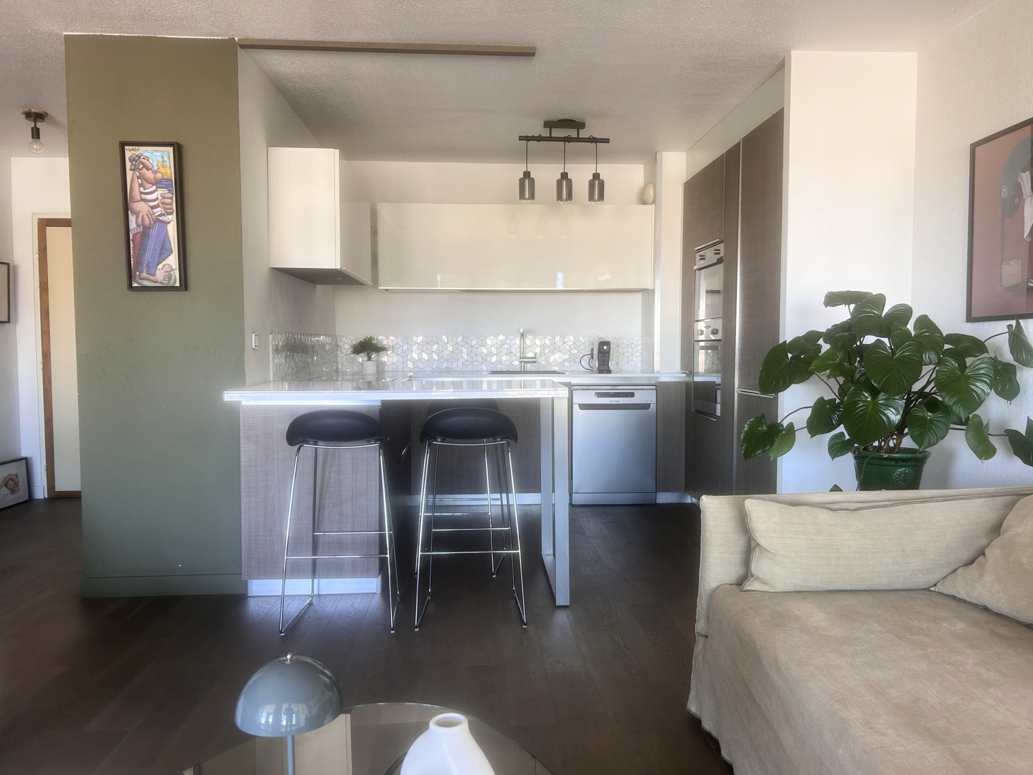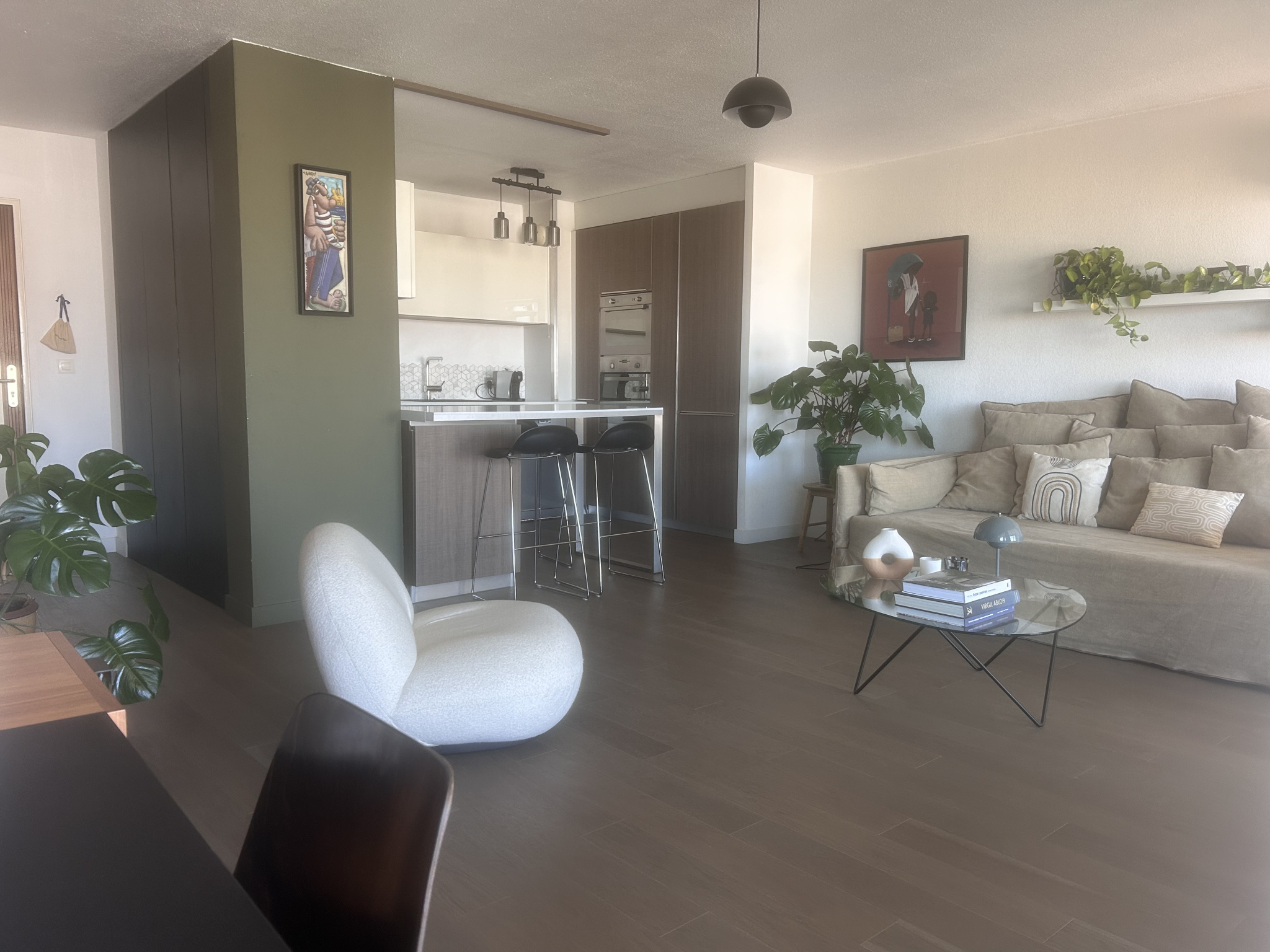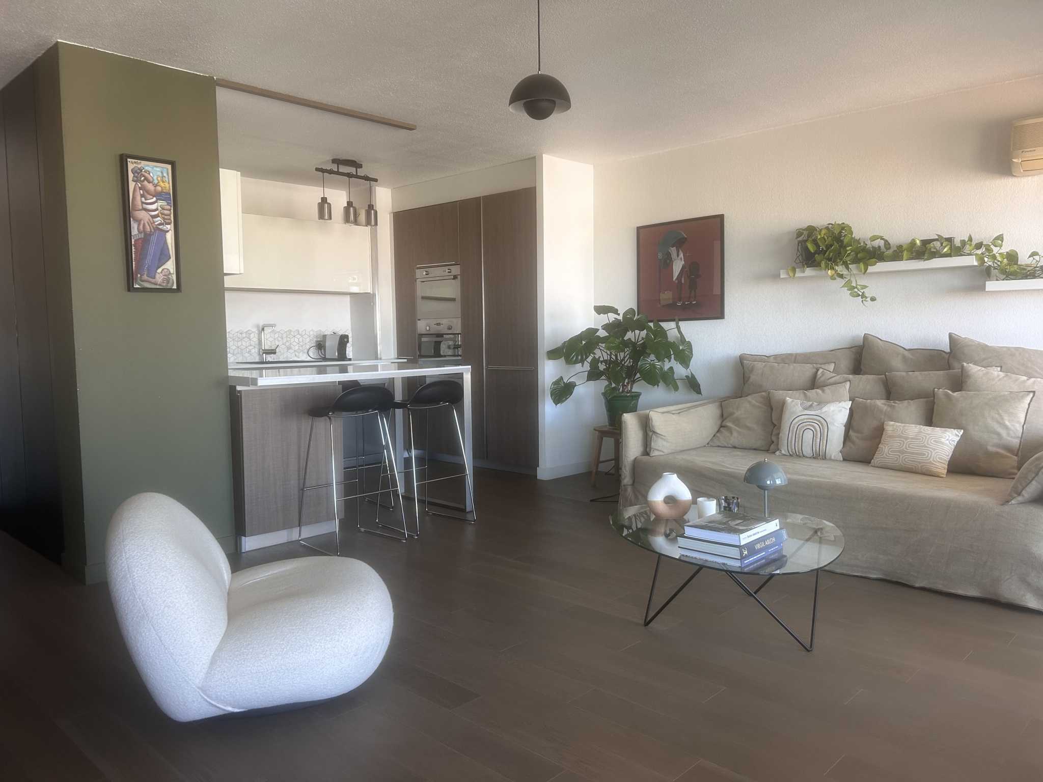 Cet appartement lumineux ouvre sur un hall avec placard desservant un vaste séjour de plus de 30m2 avec cuisine ouverte aménagée et équipée, une belle salle d'eau rénovée récemment, une chambre de près de 12m2 avec placard, WC separés. Le séjour et la chambre ouvrent sur la grande terrasse au CALME de l'âme résidentielle de ce secteur. Ce qui ne vous empêche pas de trouver de l'ambiance avec la mer et les commerces à moins de 10min à pied.