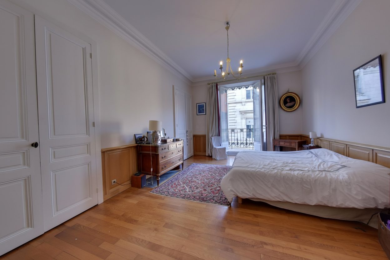 Dans un bel immeuble ancien dont les parties communes viennent d'être entièrement refaites (Décembre 2025) avec une façade en pierre de taille, élégant appartement Haussmannien triple exposition au 2ème étage avec ascenseur d'une surface de 187m².