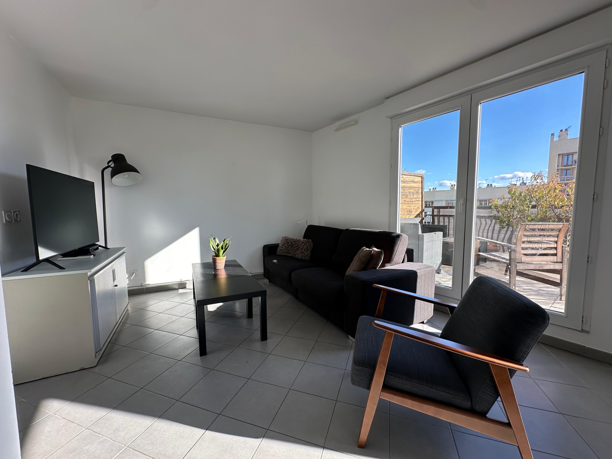 La pièce de vie spacieuse et conviviale s'ouvre sur une cuisine contemporaine entièrement équipée, bien pensée pour allier esthétique et praticité au quotidien.
