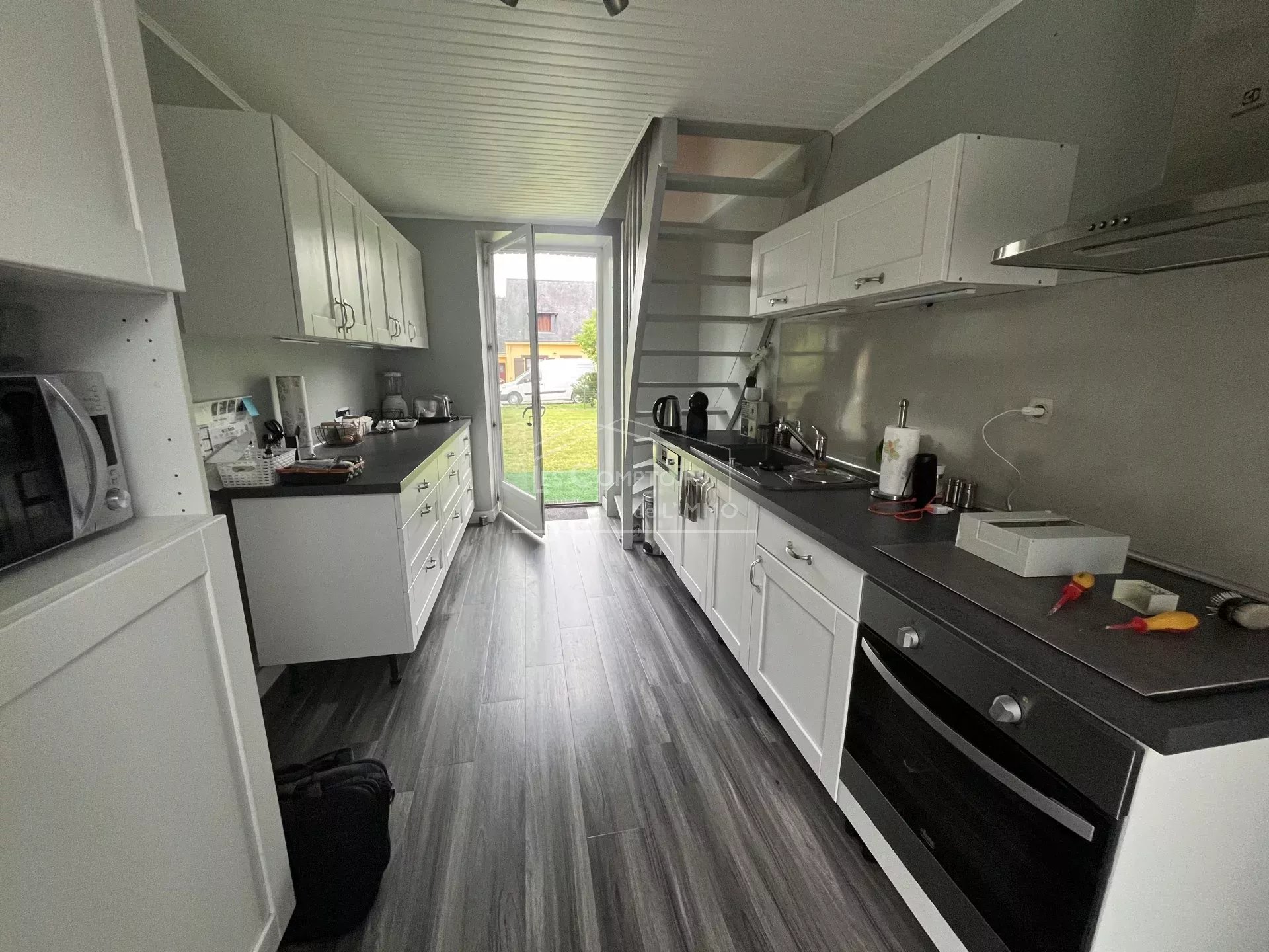 Cuisine aménagée et équipée (plaque, hotte, four, lave-vaisselle), dégagement, chambre, séjour, WC, salle de bains.