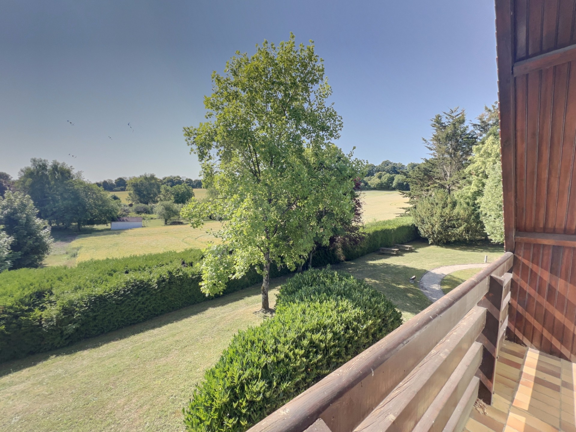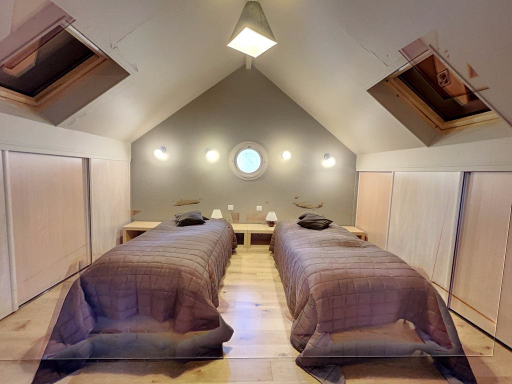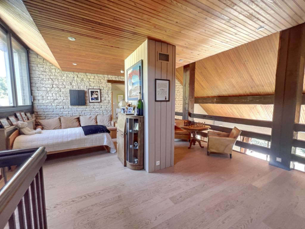 Un étage dédié à la détente et au travail : À l'étage, une mezzanine ouverte sur le salon offre un espace polyvalent, menant à une chambre, un bureau, une salle de bain avec WC, et deux autres chambres, dont une avec balcon privé, parfaites pour accueillir famille ou amis.