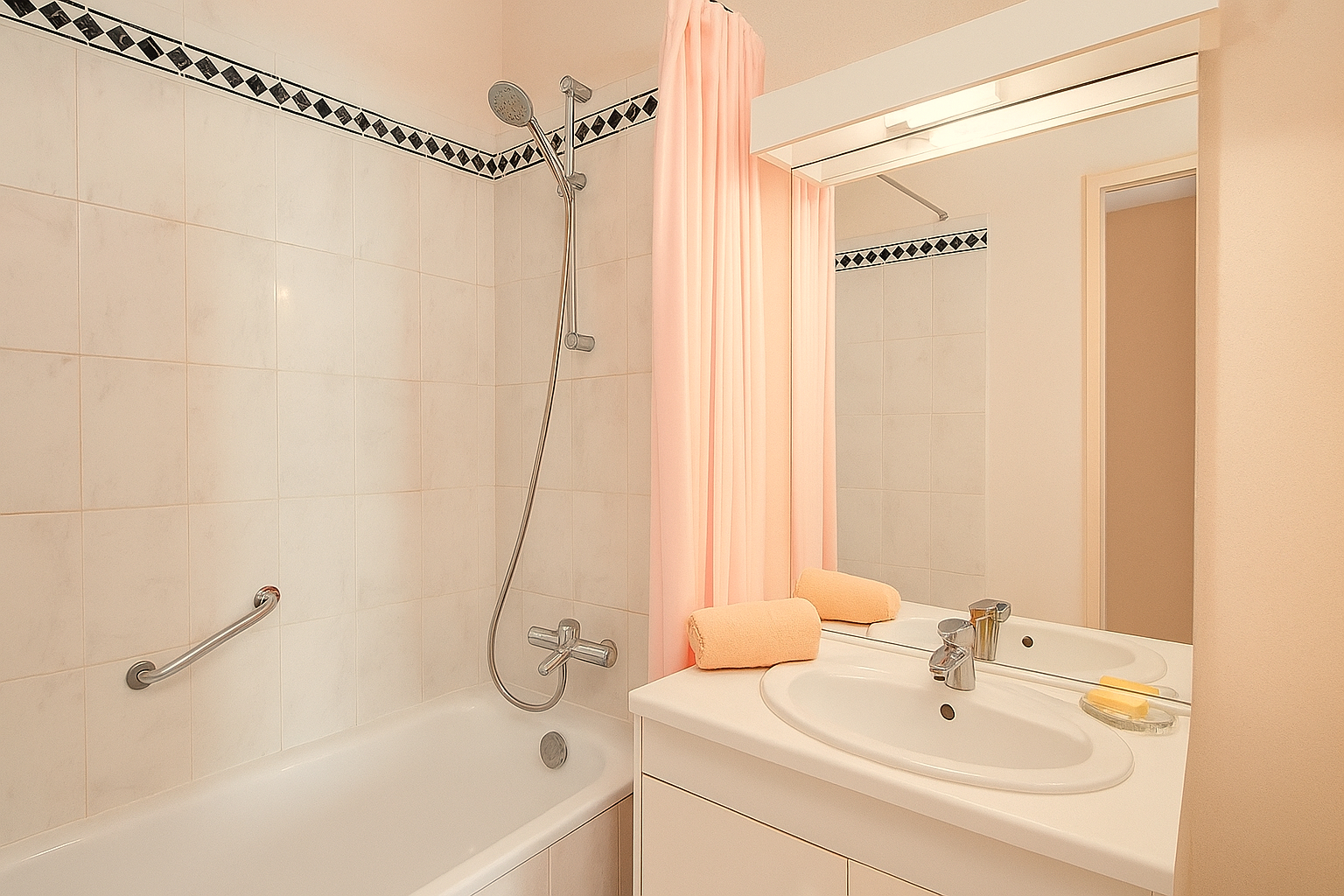 Il se compose d'une entrée avec coin cabine, d'une pièce de vie avec cuisine aménagée, ouvrant sur une belle terrasse. Deux chambres dont une avec placard, une salle de bains et WC séparés.