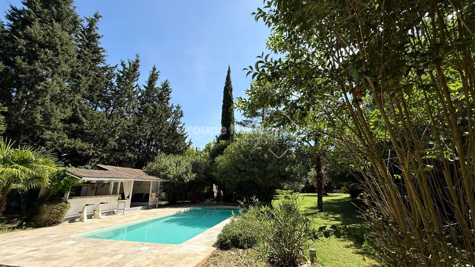 À l'extérieur, l'environnement est tout simplement exceptionnel : un parc arboré de plus de 5 hectares, véritable havre de paix, et une piscine parfaitement intégrée à l'espace jardin, invitent à la détente et à la convivialité.