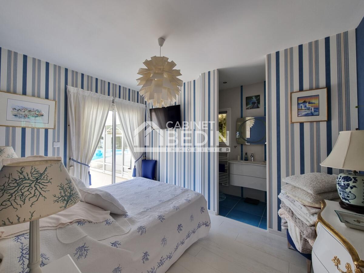 Quelques un des autres atouts de la maison : un salon/séjour cathédrale ouvert sur la piscine avec cheminée fonctionnelle, une cuisine entièrement équipée ou bien encore une chambre parentale avec son salon bibliothèque et sa salle d'eau.
