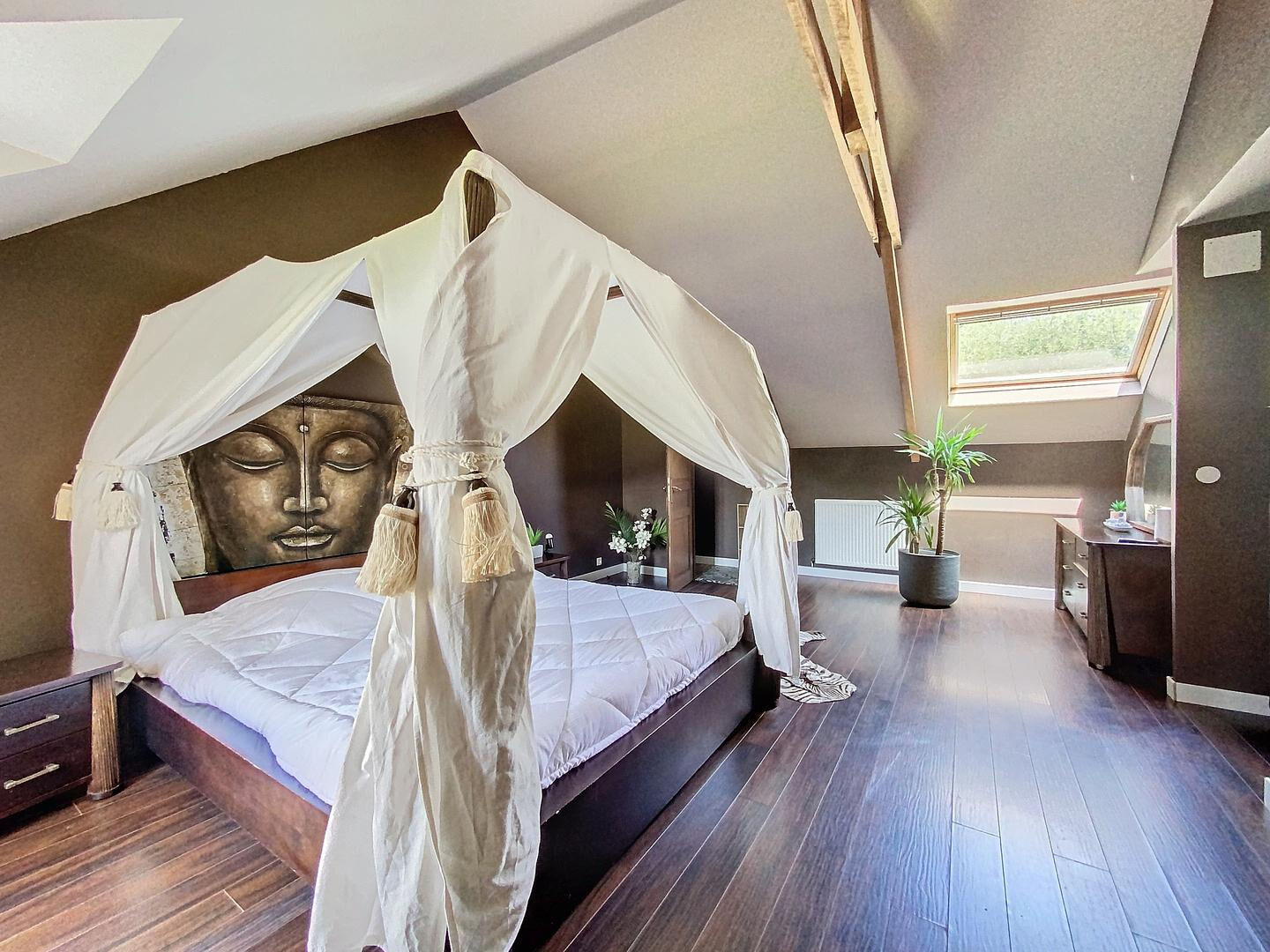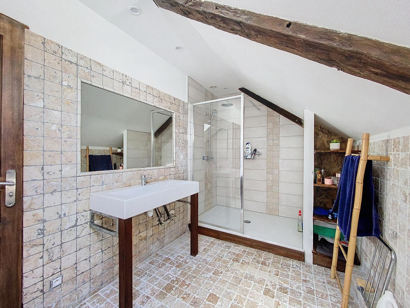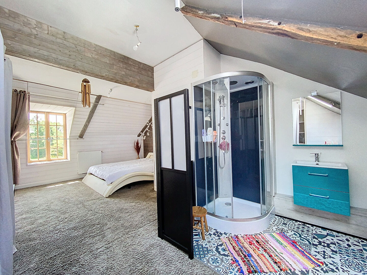 À l'étage, quatre chambres spacieuses et lumineuses, dont une avec salle de bain proposant baignoire et douche, et un WC séparé complètent les espaces de vie.
