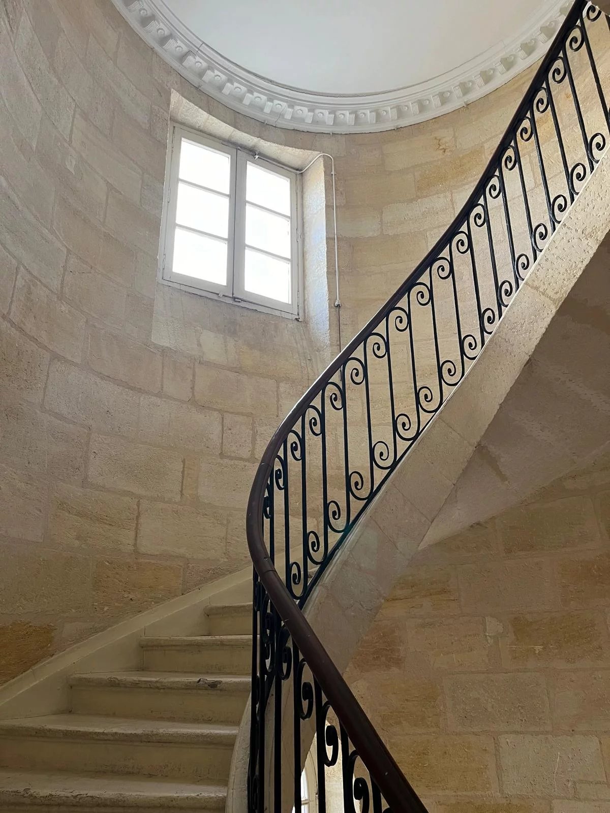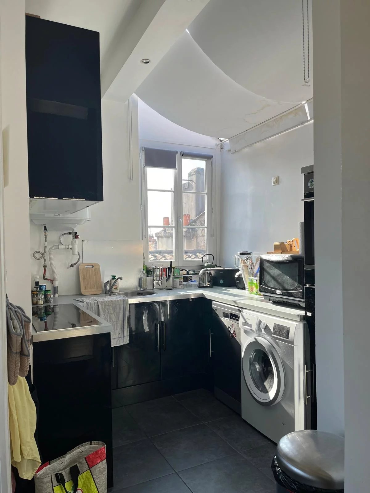 A l'étage, une pièce de vie lumineuse et climatisée, une cuisine séparée toute équipée, une salle de bain avec toilette et une grande chambre avec rangements. L'immeuble à une cage d'escalier remarquable.