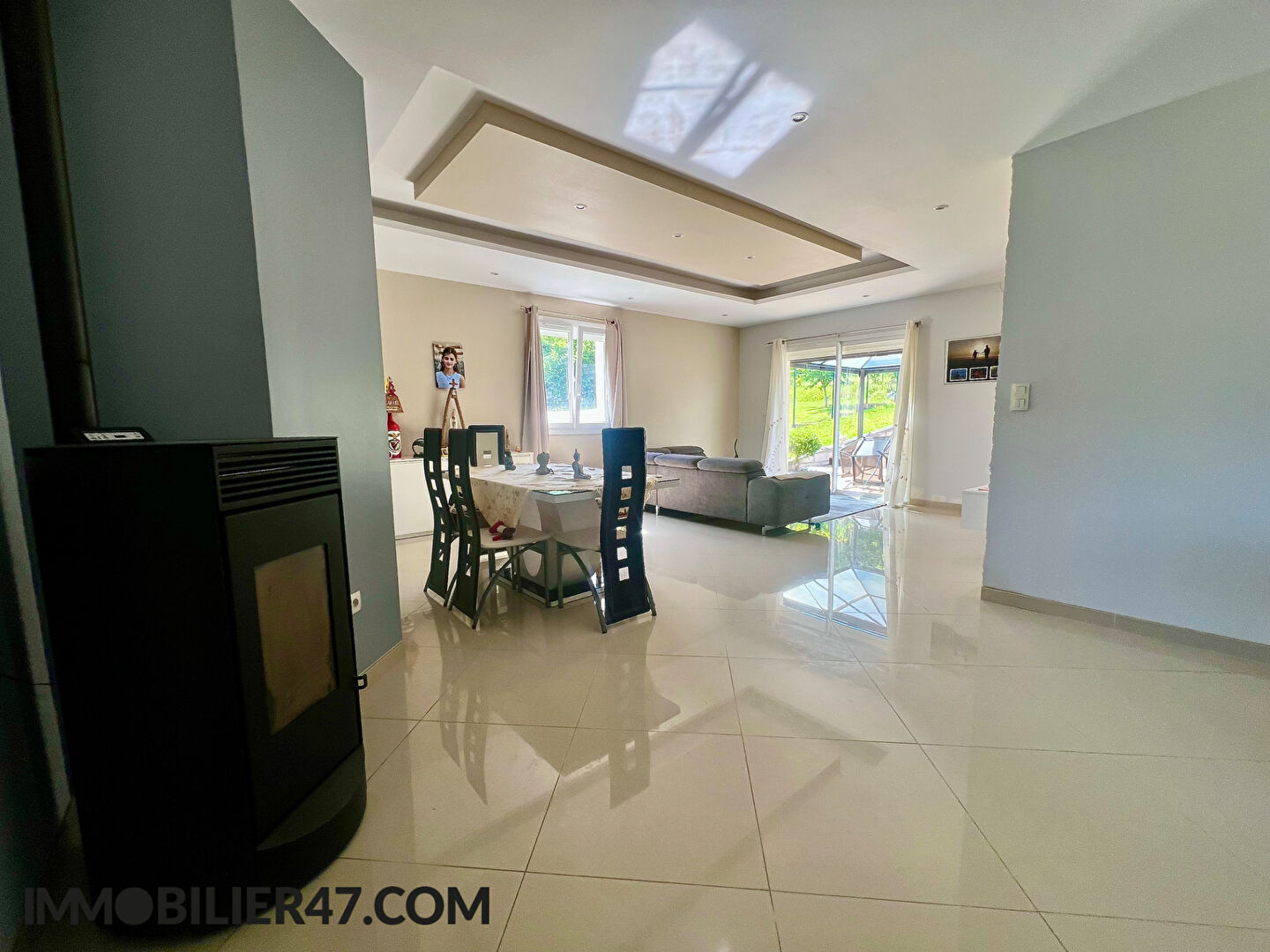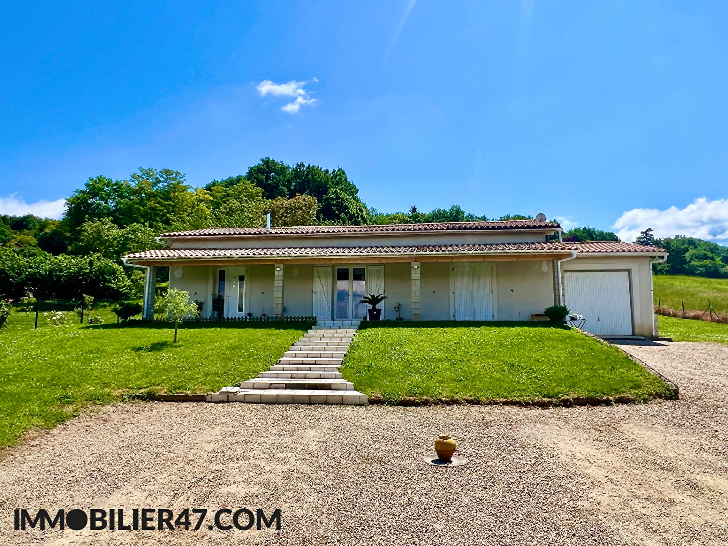 Sur la commune d'Aiguillon (47190), en campagne, villa de plain pied de construction traditionnelle et en parfait état, composée de trois chambres, vaste pièce à vivre d'environ 50m2, avec cuisine équipée et poêle à granules. Le tout sur environ 4200m2 de terrain clôturé avec piscine (dont une partie constructible). Joli point de vue dominant. Les honoraires d'agence sont à la charge du vendeur.