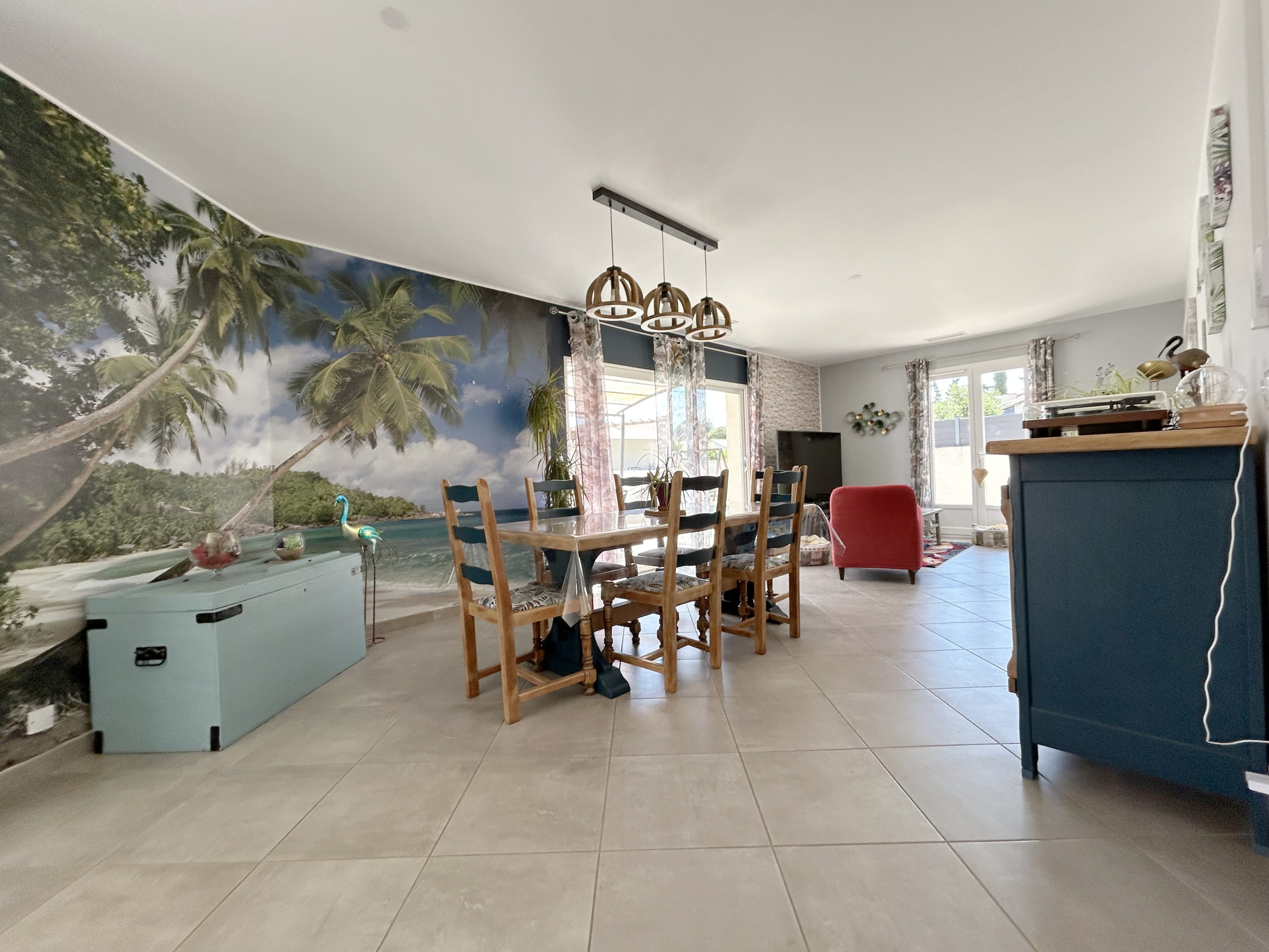 Une grande pièce à vivre lumineuse avec cuisine ouverte, donnant directement accès à une spacieuse terrasse, idéale pour profiter des beaux jours.
