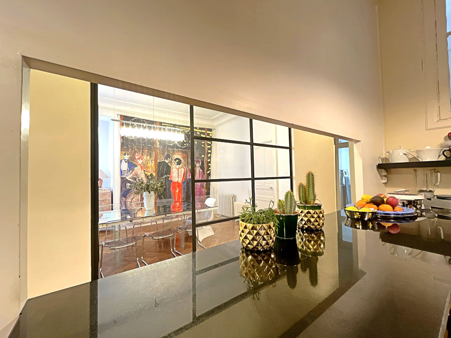 La salle à manger, située côté cour et ornée d'une cheminée chauffe-plat en marbre de Sarrancolin, est séparée de la cuisine par une élégante verrière et entièrement meublée, équipée, avec plan de travail en granit noir du Brésil ainsi qu'un passe-plats.