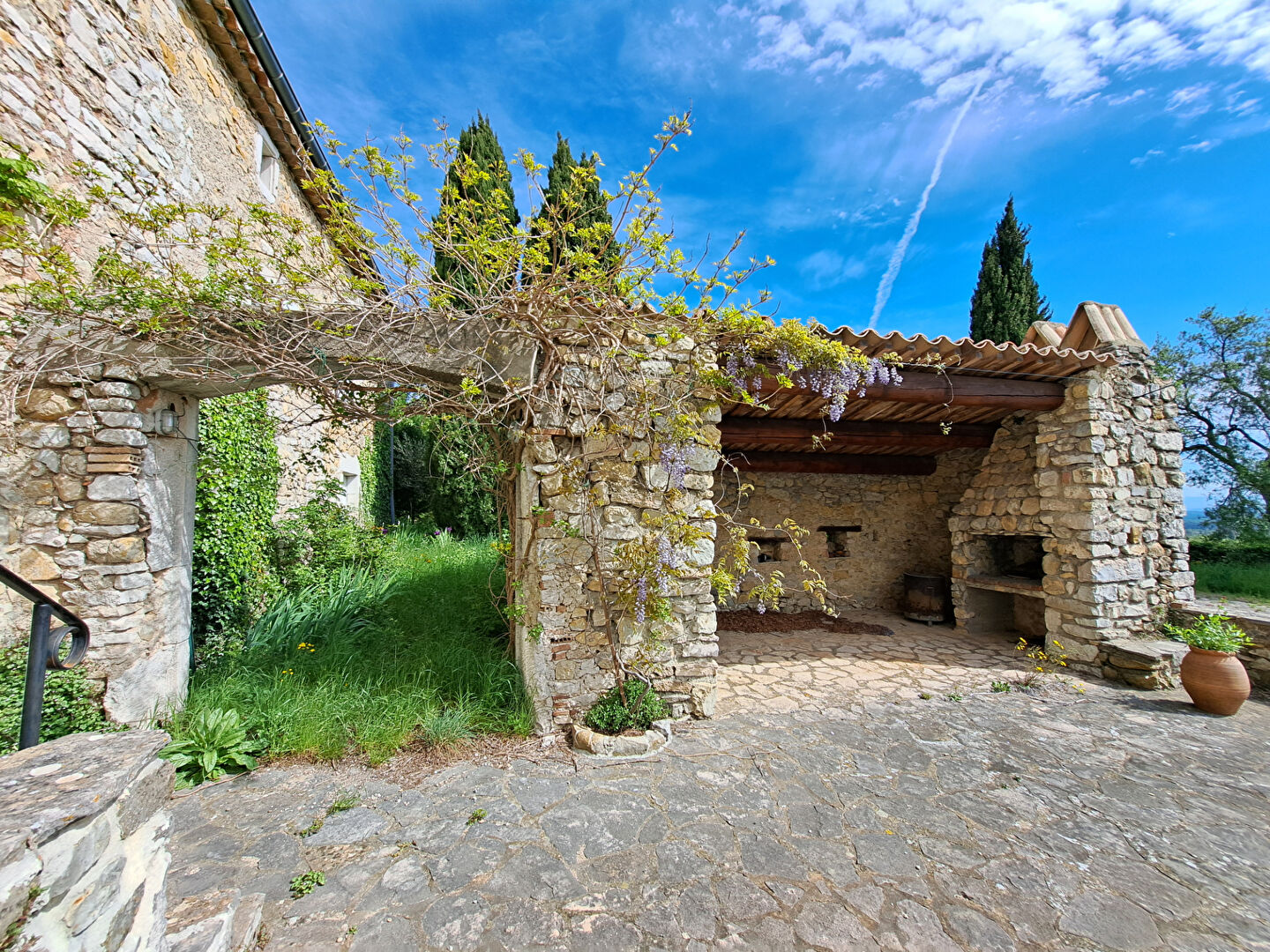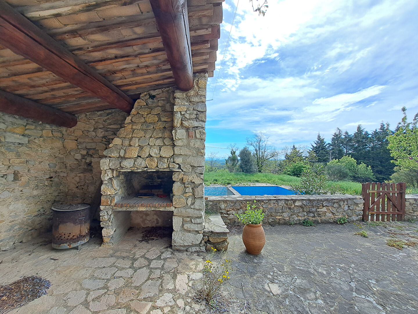 Une vaste terrasse, ombragée et toute en pierre apparente vous accueille pour des repas en plein air face à un paysage grandiose.