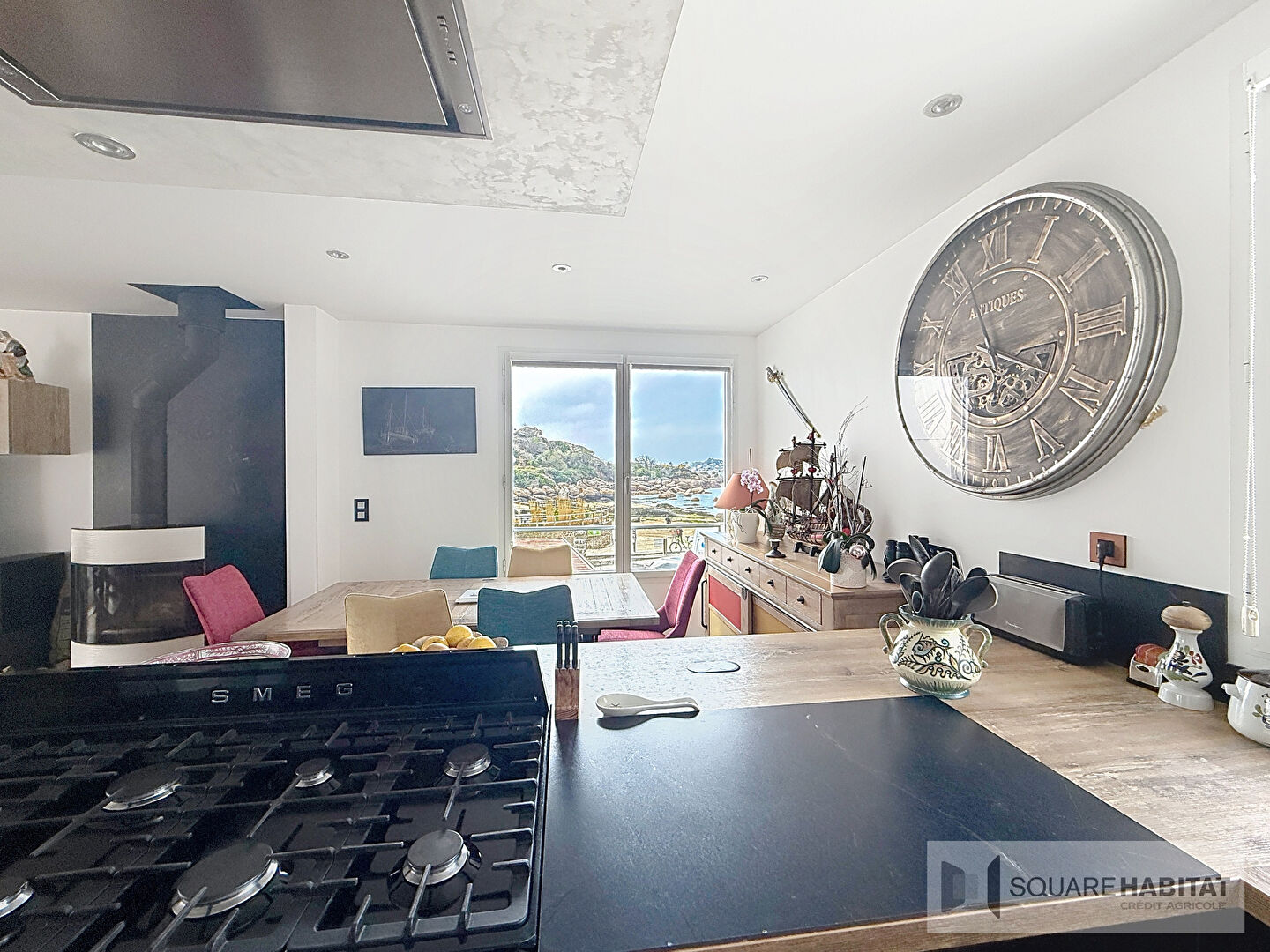 Salon / séjour de 30m2 avec cuisine ouverte, vue sur la belle plage de Saint-Guirec et sur la mer. Deux chambres, une salle d'eau, une terrasse de 15m2 exposée Sud.