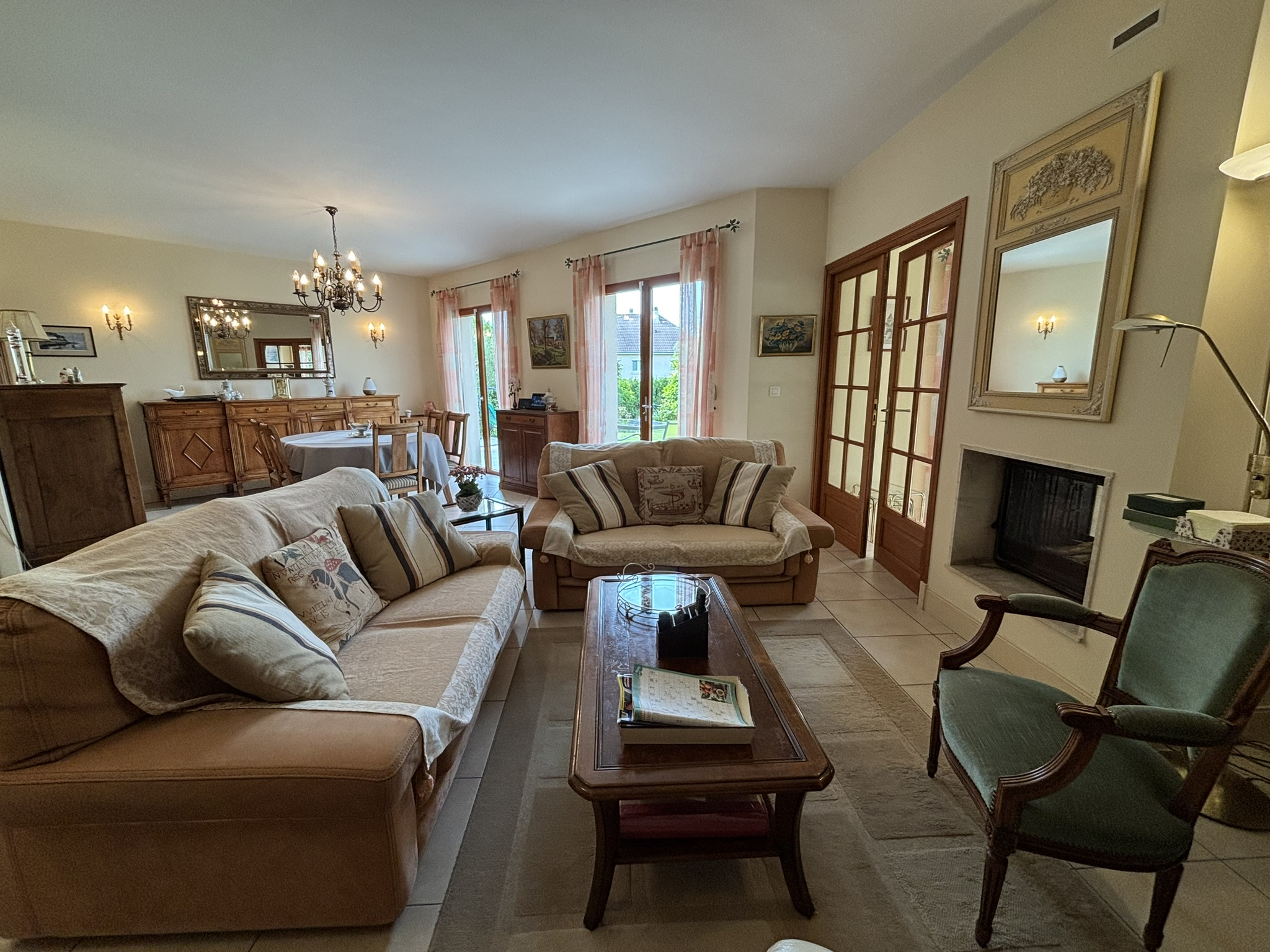 Au rez-de-chaussée : o Entrée accueillante o Vaste séjour/salon lumineux avec cheminée à double foyero Salle à manger o Cuisine indépendante + arrière-cuisine/lingerie o Chambre de 14 m2 avec salle de bains attenante, idéale pour une vie de plain-pied o Belle terrasse orientée jardin pour vos moments de détente