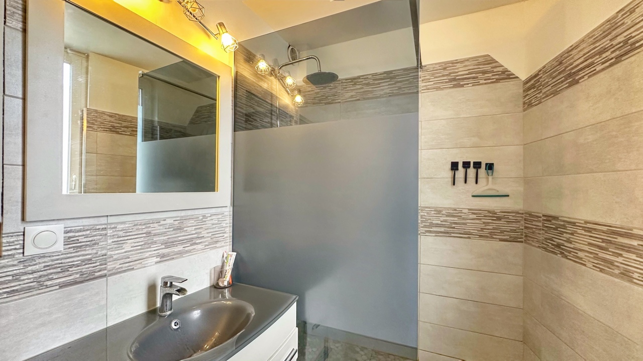 L’appartement se compose sur le 1° niveau d’une entrée, d’une cuisine ouverte sur une pièce de vie d'environs 24 m², d’une chambre de 13,5 m², d’une SDE de 5 m² et d’un WC indépendant.