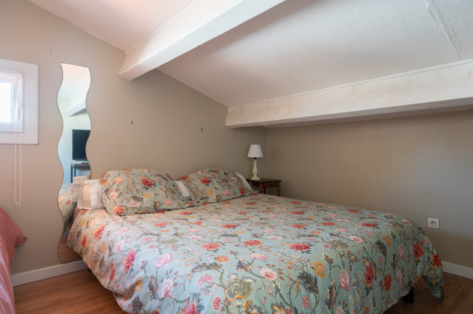 Proche de toutes commodités, accessible depuis un charmant jardin paysager, l'entrée se trouve à l'étage supérieur. Ce premier niveau accueille un bel espace de vie lumineux avec séjour, cuisine ouverte et salle de bains contemporaine, le tout prolongé par un balcon couvert bien orienté, offrant une vue mer. À l'étage, deux chambres sous combles, chaleureuses et optimisées avec de nombreux rangements, bénéficient d'un point d'eau avec WC.