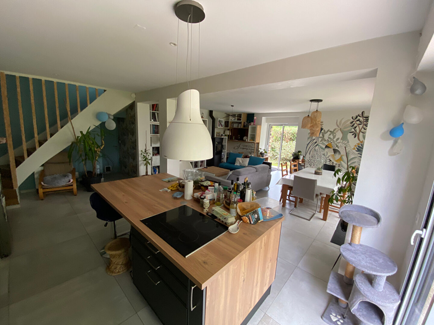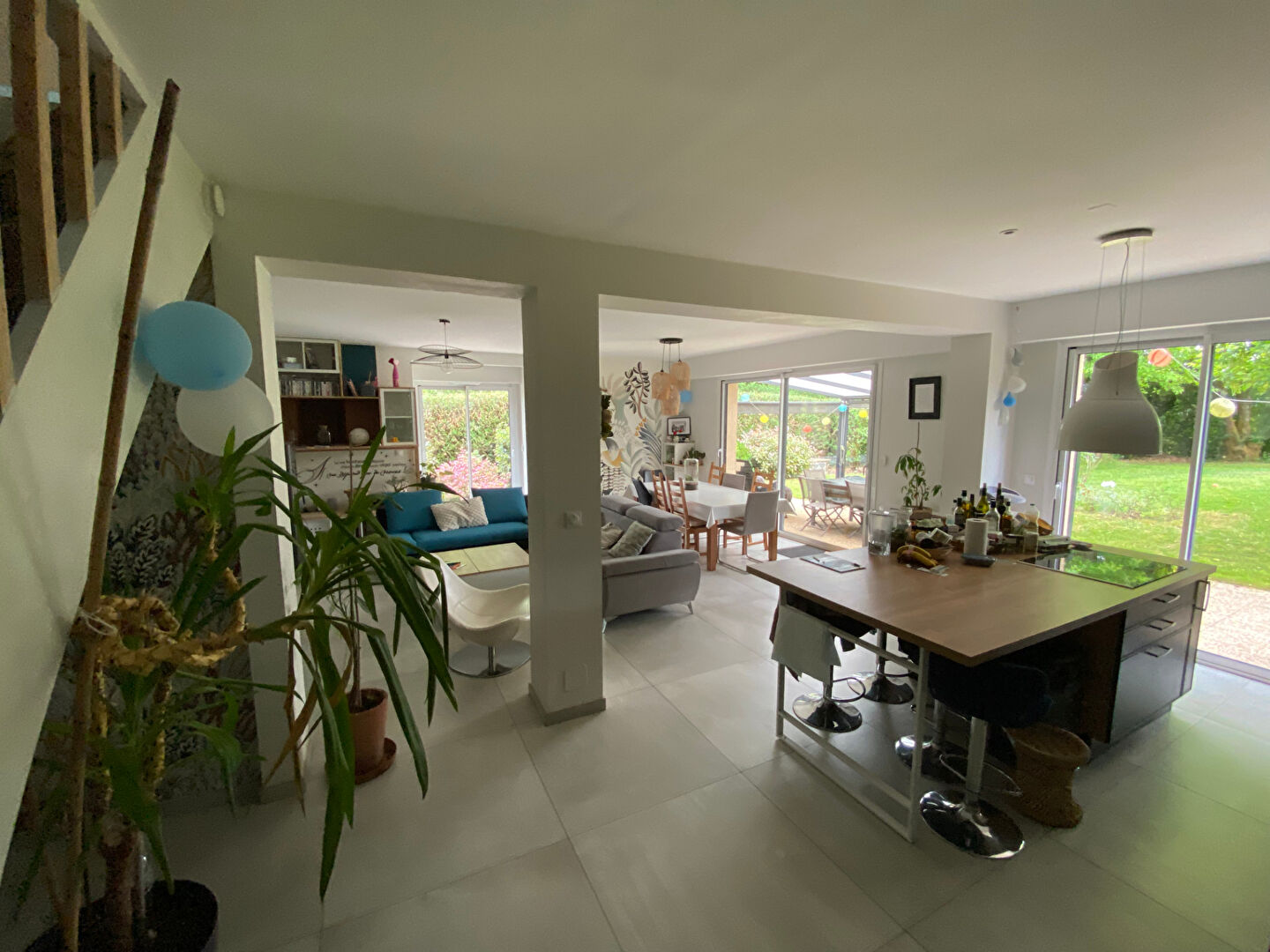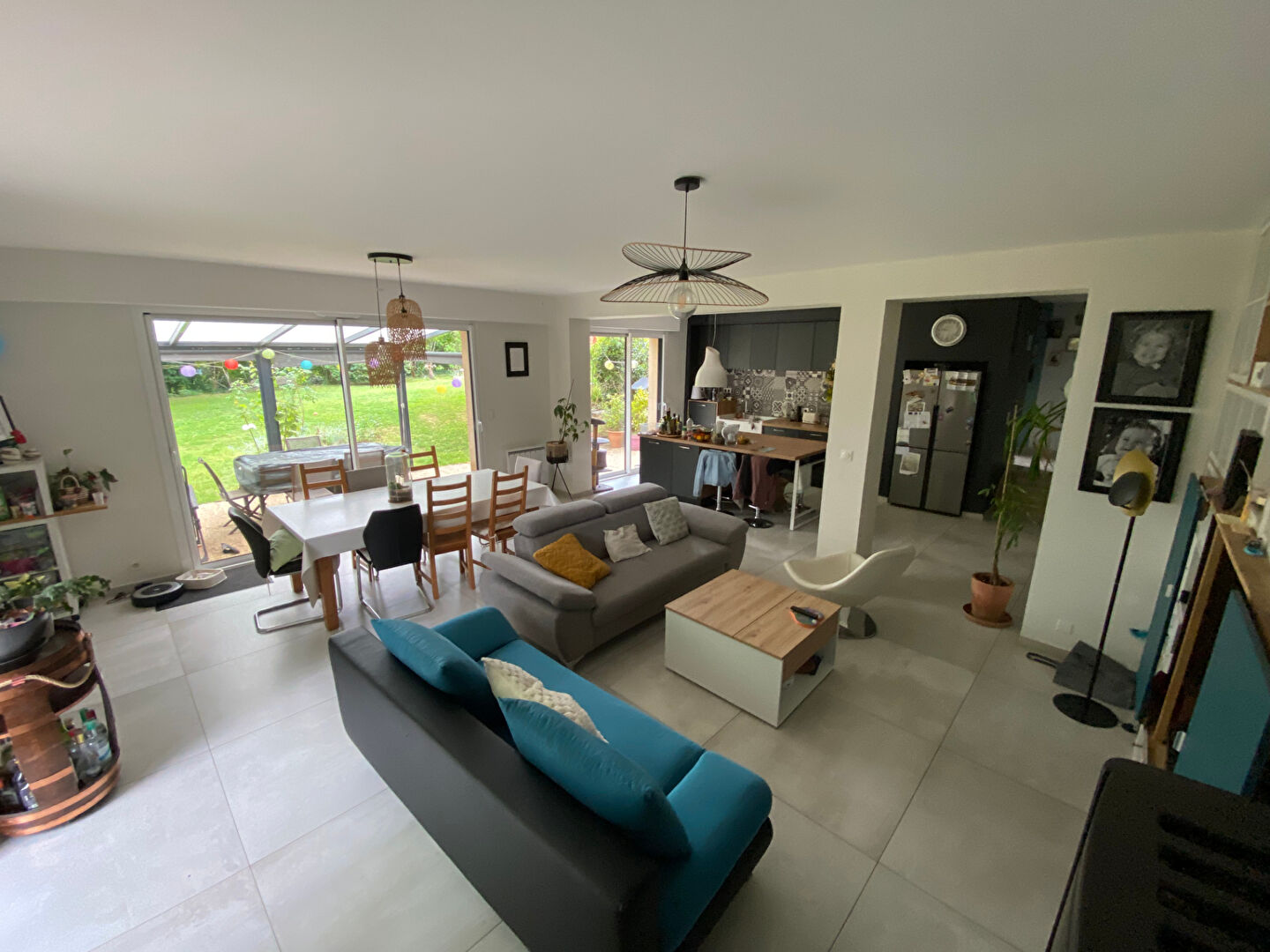 Aux portes de Laval, propriété restaurée offrant de plain-pied : entrée, salon/séjour avec poêle à pellets donnant sur terrasse plein sud, cuisine aménagée et équipée, une chambre avec salle d'eau privative, toilettes. À l'étage, palier desservant trois chambres, salle de bains/wc, pièce de jeux. Garage, cave et buanderie. Terrain sans vis-à-vis.