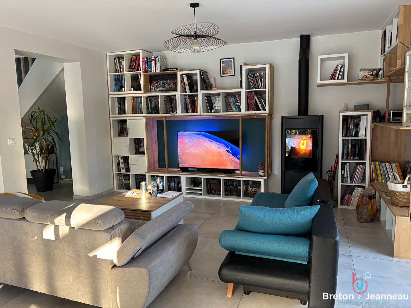 Propriété L'Huisserie offrant de plain-pied : entrée, salon/séjour avec poêle à pellets donnant sur terrasse plein sud, cuisine aménagée et équipée, une chambre avec salle d'eau privative, toilettes. À l'étage, palier desservant trois chambres, salle de bains/wc, pièce de jeux. Garage, cave et buanderie. Terrain sans vis-à-vis.