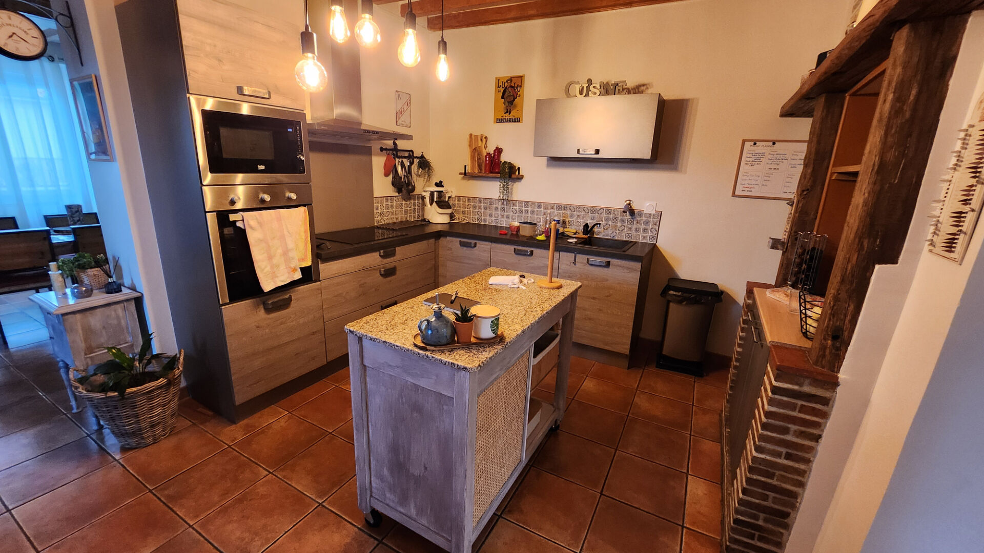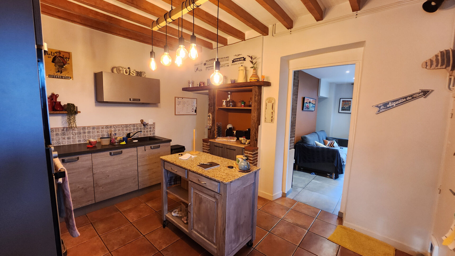- Belle pièce de vie chaleureuse comprenant un salon convivial et une cuisine aménagée ouverte, idéale pour les moments en famille.
