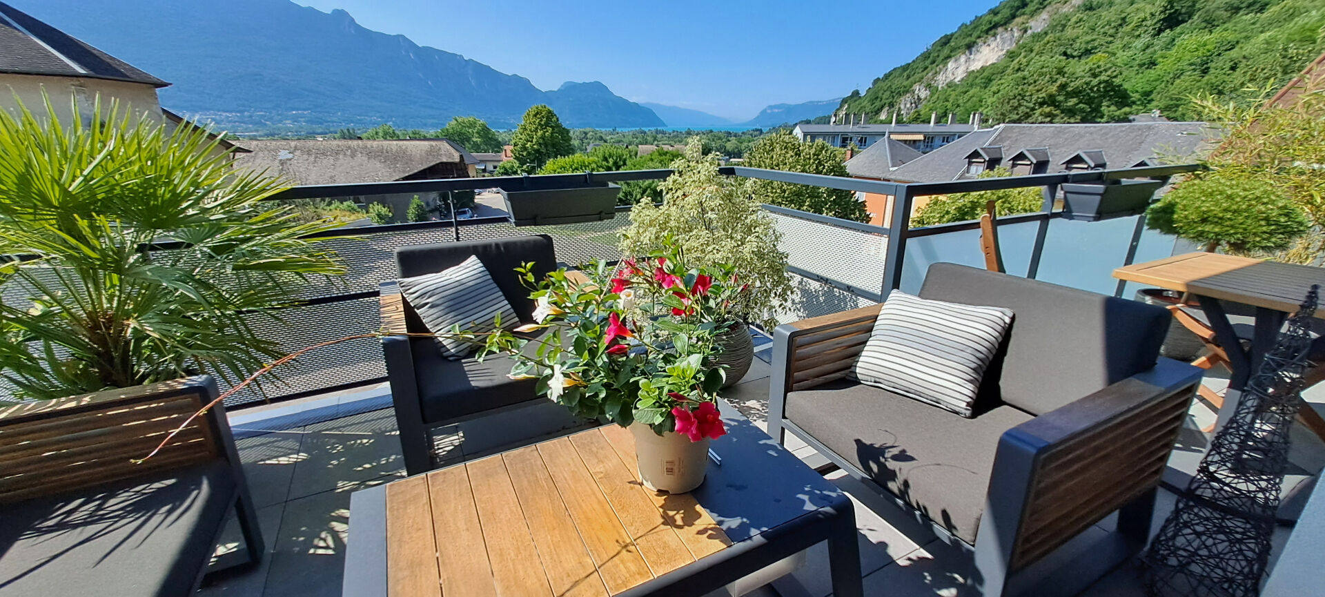 Balcon confortable avec une jolie vue imprenable sur le lac du Bourget