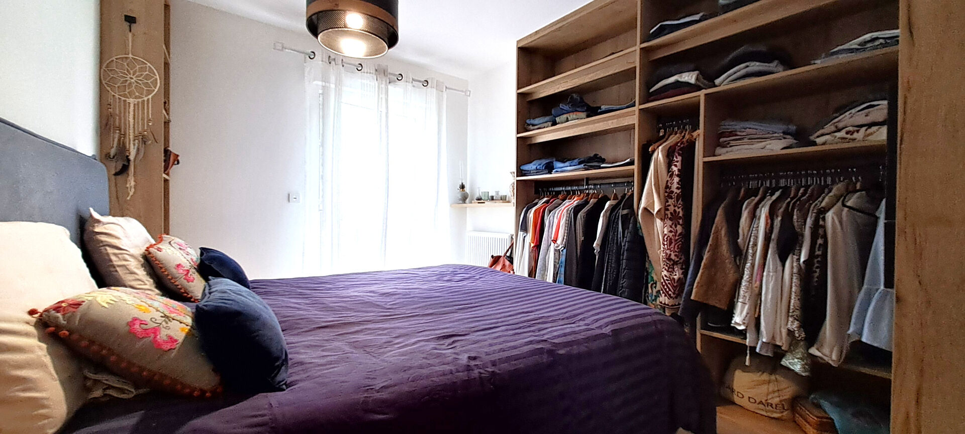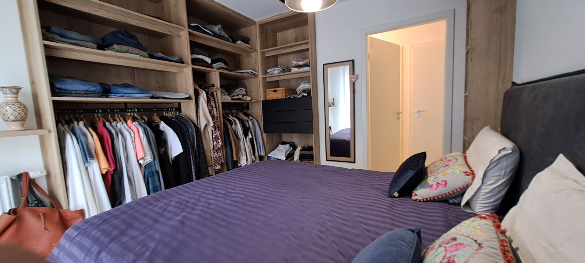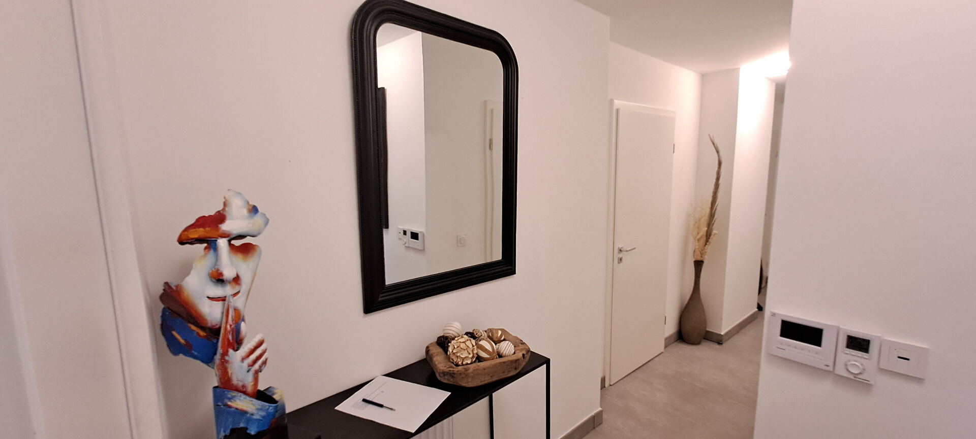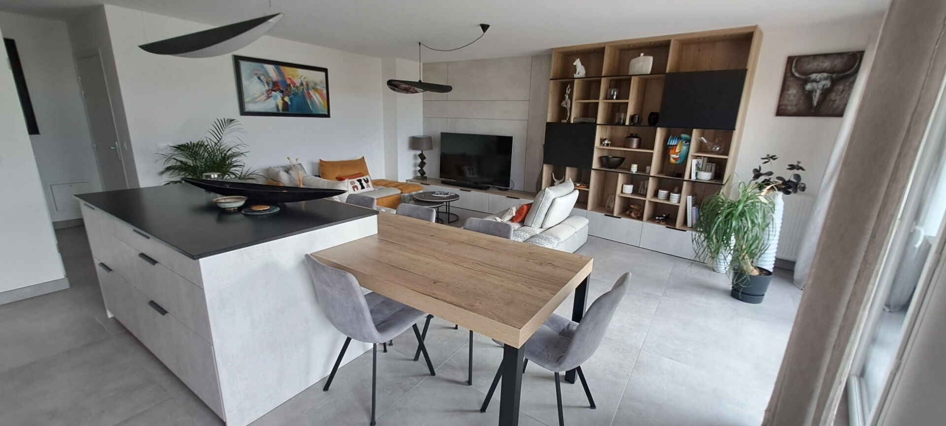 Distribution intérieure moderne et cohérente avec une entrée avec placard, un grand séjour cuisine totalement aménagé avec du mobilier intégré haut de gamme, avec un ilôt central -espace repas en complément de la cuisine équipée et un espace salon en harmonie avec la pièce, deux chambres, dont une avec placard intégré, l'autre avec un dressing aménagé, WC suspendu indépendant, salle de bain et buanderie.