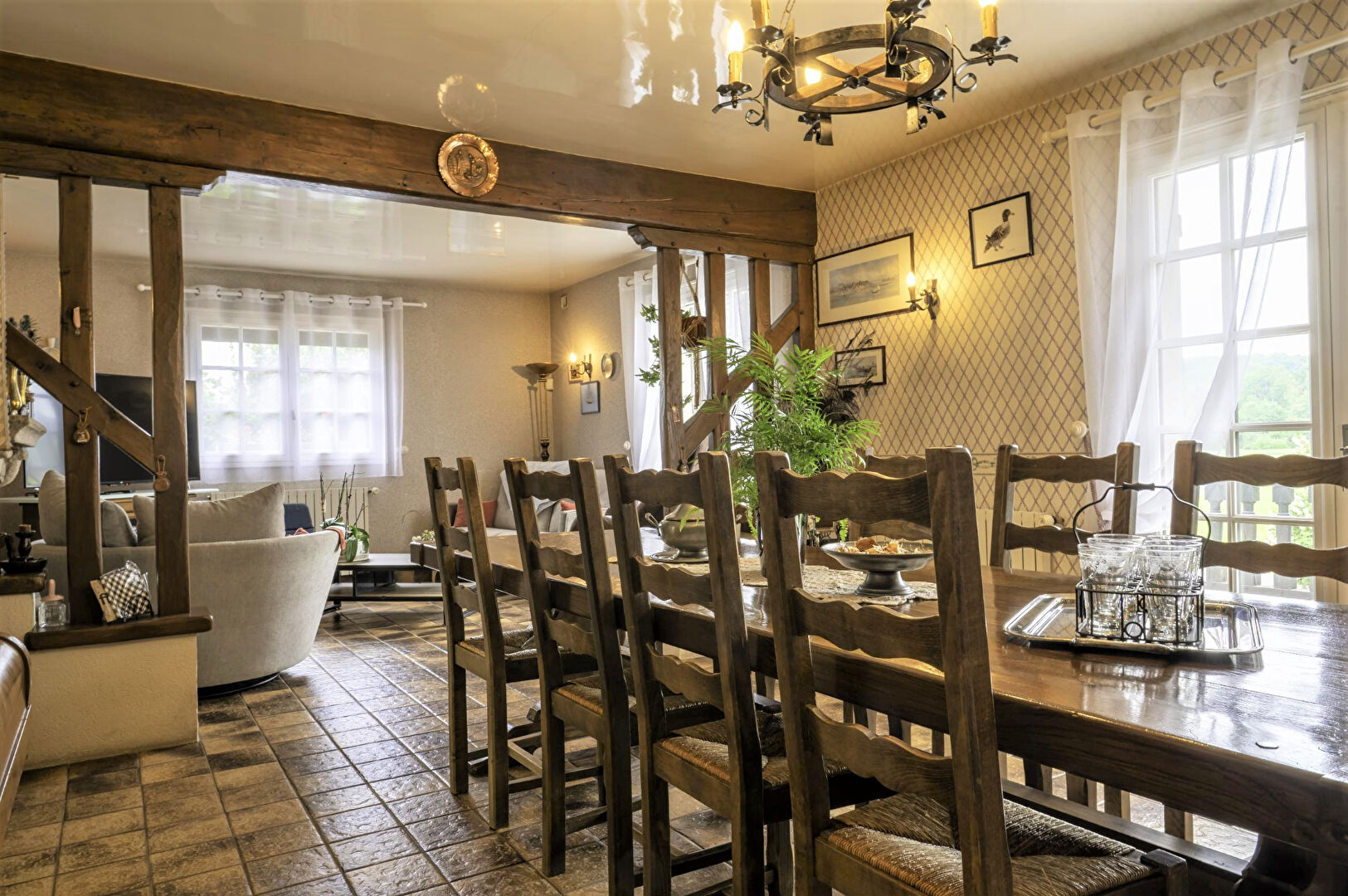 Une belle terrasse surplombant la campagne , un sous -sol total, un garage et un jardin clos et arboré.