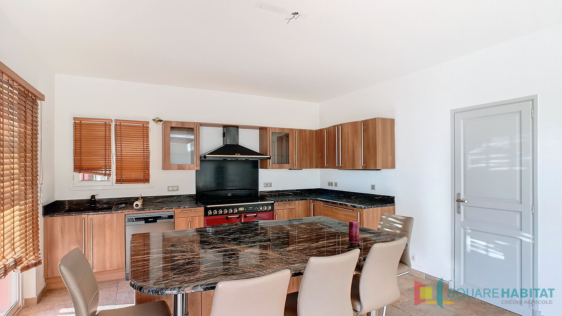 - en rez-de-jardin : entrée avec toilettes, salon avec cuisine ouverte (49 m²), buanderie, cellier, chambre avec dressing et salle d'eau :