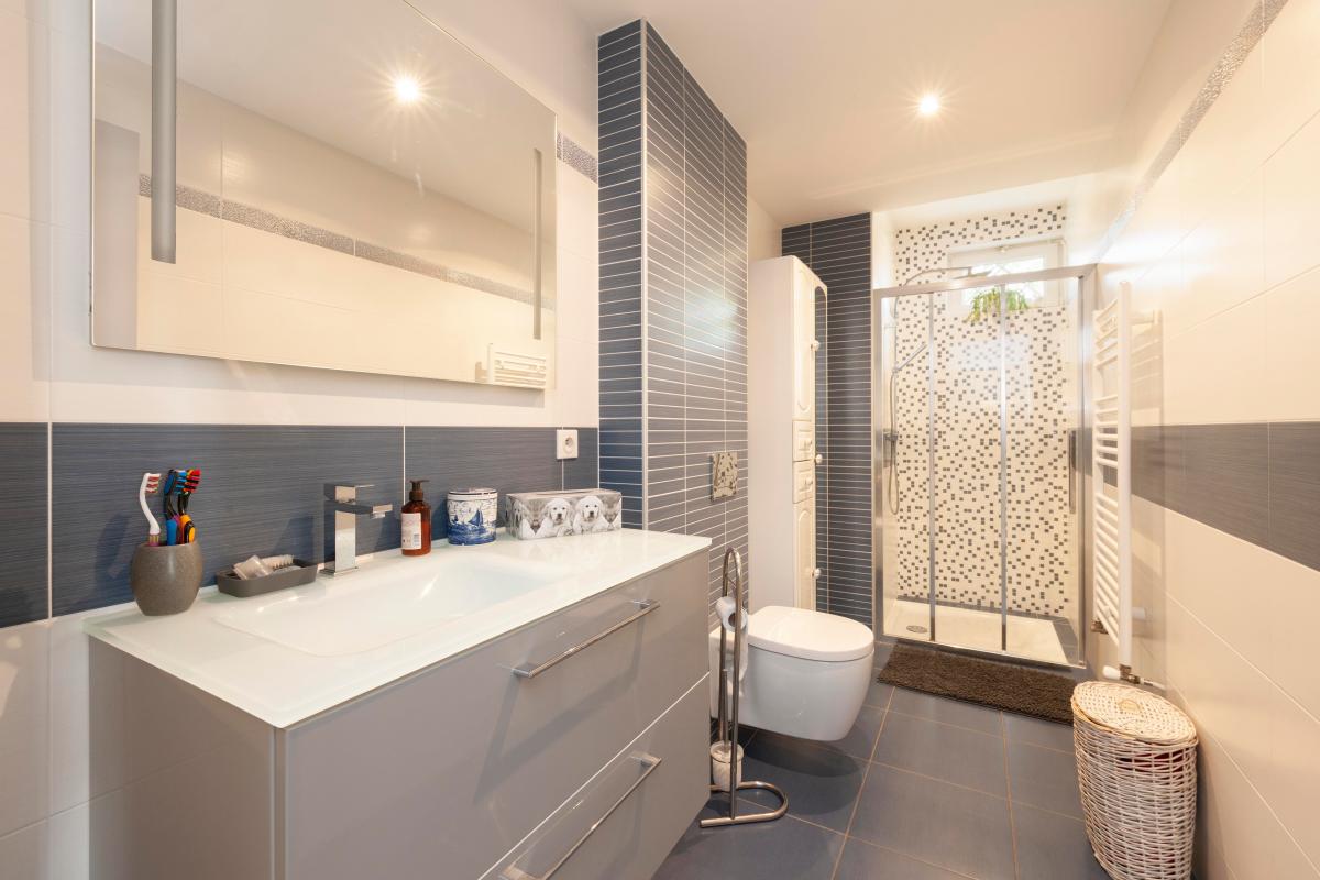 - au sol-sol : un double garage, une buanderie, un vestiaire avec douche et wc, une cave et un espace pour le silo à pellets.