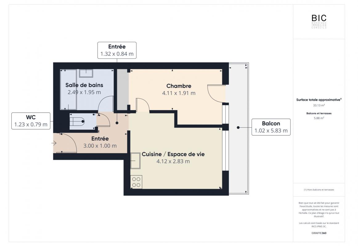 D'une superficie de 33,66 m2, il est composé d'une entrée (4,16 m2) avec les wc sur la gauche (0,97 m2), d'une salle de bains avec baignoire, vasque et lave-linge (4,70 m2). Puis on accède à la pièce de vie de 13 m2 environ avec kitchenette équipée. Enfin on accède à une chambre de 10,55 m2 avec penderie. Une place de parking avec arceaux vient compléter ce bien ainsi qu'une cave de 6 m2 environ . Local à vélo et local à poussettes.