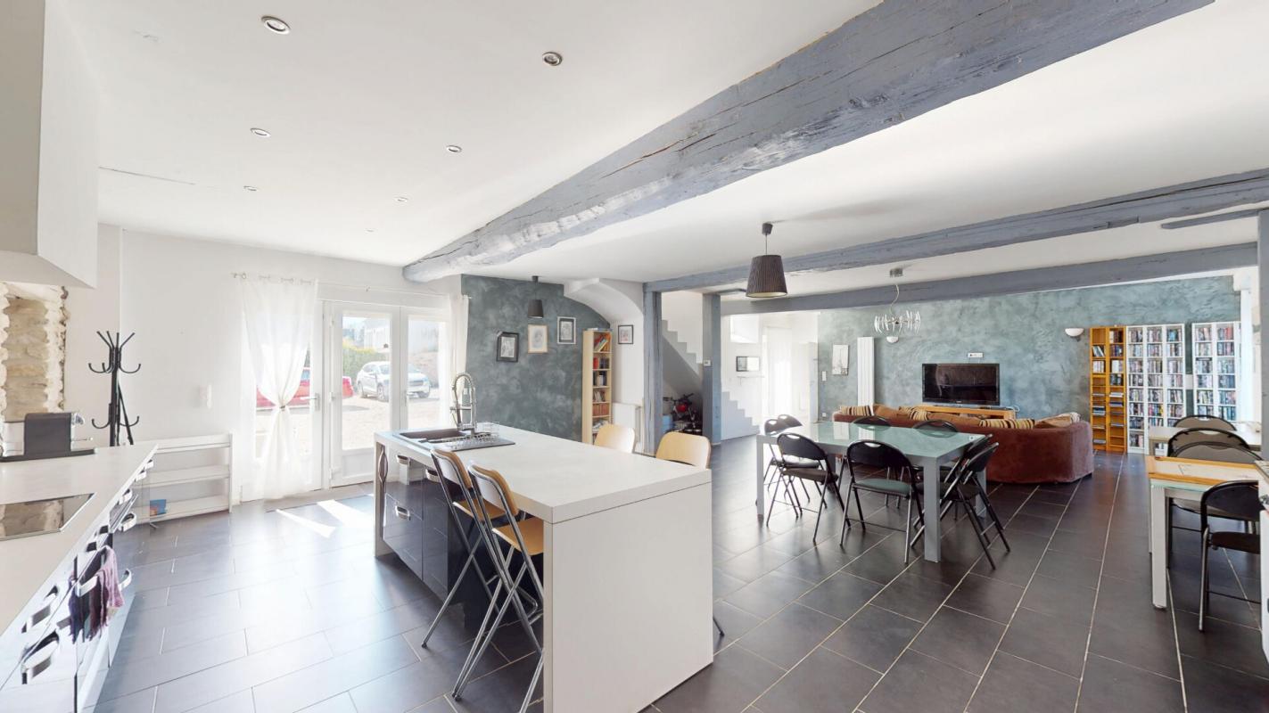 Une vaste pièce de vie de 63 m² comprenant cuisine ouverte équipée, salle à manger avec piano de cuisson, four à pain, arrière-cuisine ;