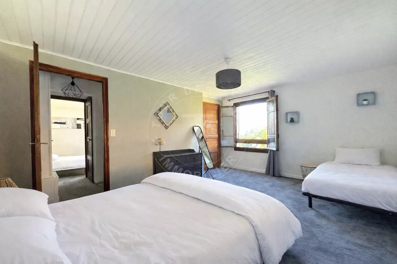 La maison dispose également d’un grand sous-sol avec garage, buanderie, cave et espaces de rangement.