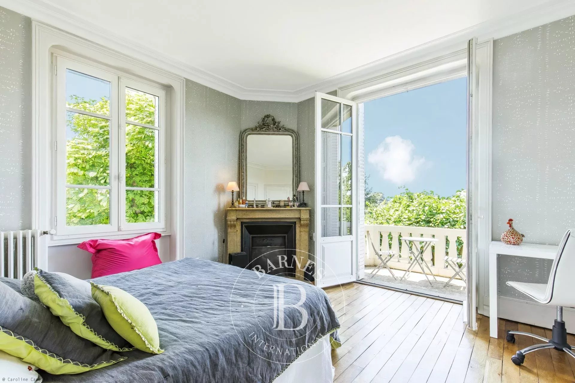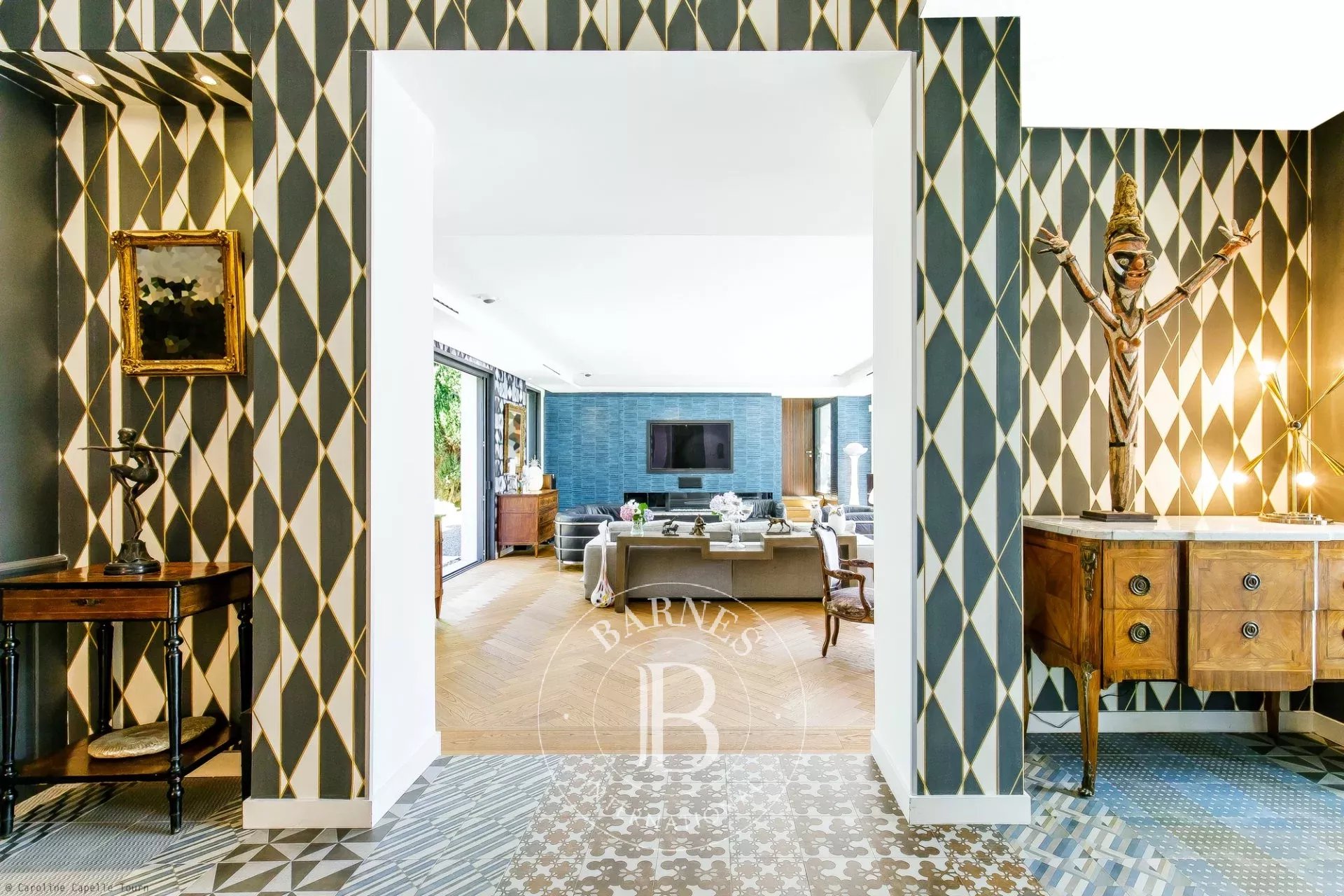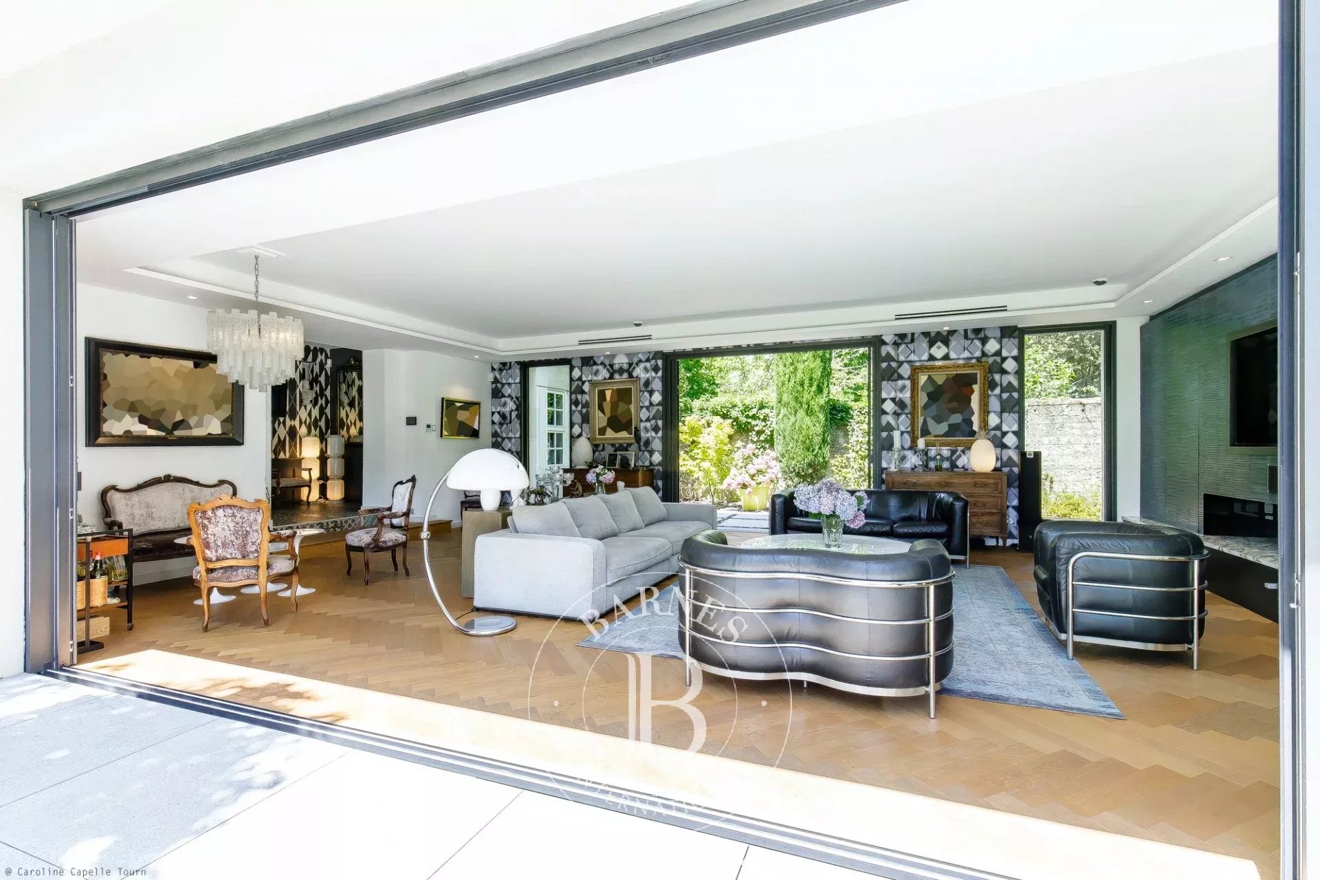 Elle se compose en rez-de-jardin d'une pièce de vie traversante de 60 m² entièrement ouverte sur l'extérieur grâce à ses grandes baies vitrées, une cuisine indépendante baignée de charme et de lumière. Une salle à manger attenante et un grand bureau / bibliothèque.