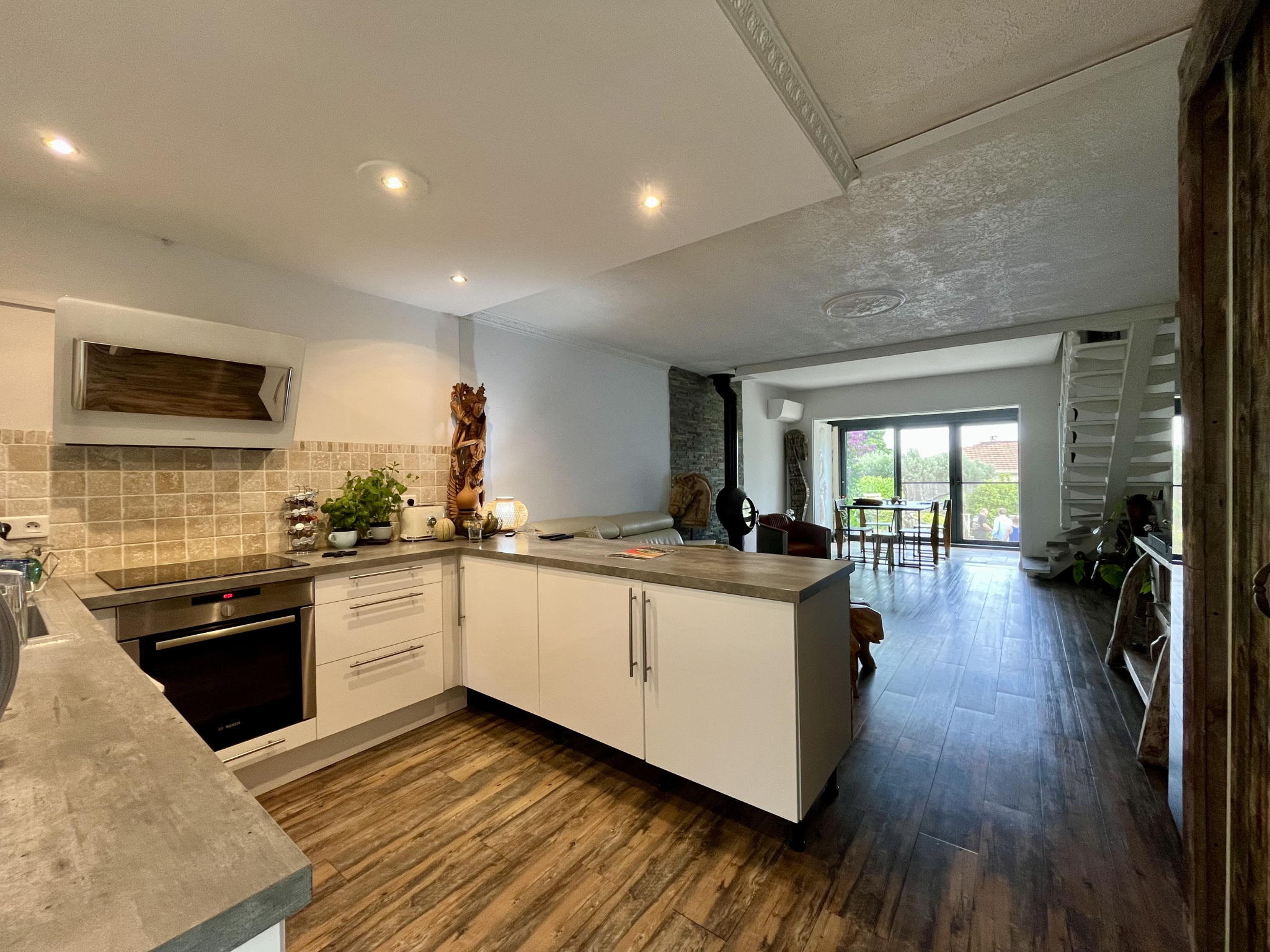 Entièrement rénovée avec goût, la maison bénéficie de belles prestations : poêle à bois, climatisation réversible, menuiseries en aluminium avec double vitrage.