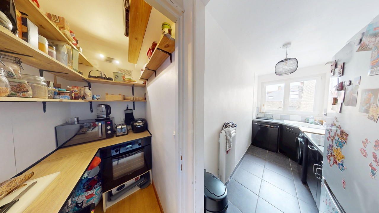 L'appartement se compose d'un vaste séjour de plus de 23 m², exposé est-ouest, baigné de lumière naturelle. Il comprend également deux chambres, une cuisine aménagée avec arrière-cuisine, une salle d'eau, des WC séparés, ainsi que plusieurs espaces de rangement (placards, cellier, cave). Les sols en parquet flottant apportent une ambiance chaleureuse et accueillante.