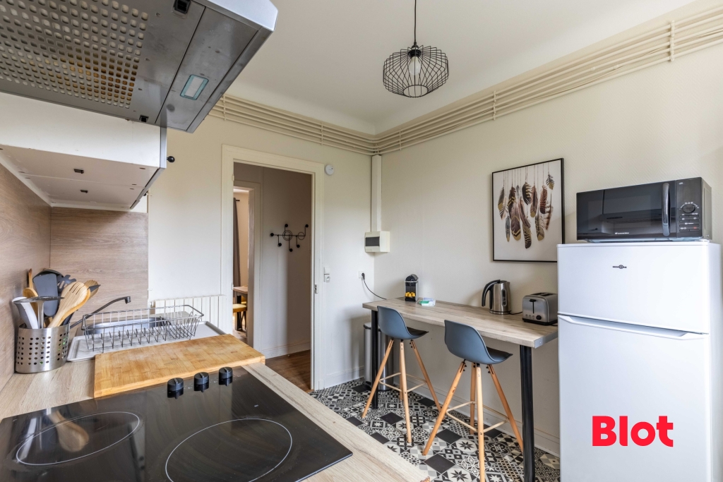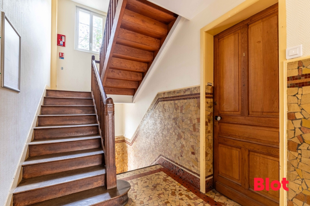 Il se compose d'une entrée donnant sur un séjour exposé Sud avec une cheminée et un parquet massif. La cuisine, aménagée et équipée bénéficie d'une petite arrière-cuisine. Deux grandes chambres sur parquet et également avec cheminées art-déco complètent cet appartement. Enfin une salle d'eau avec WC séparés.